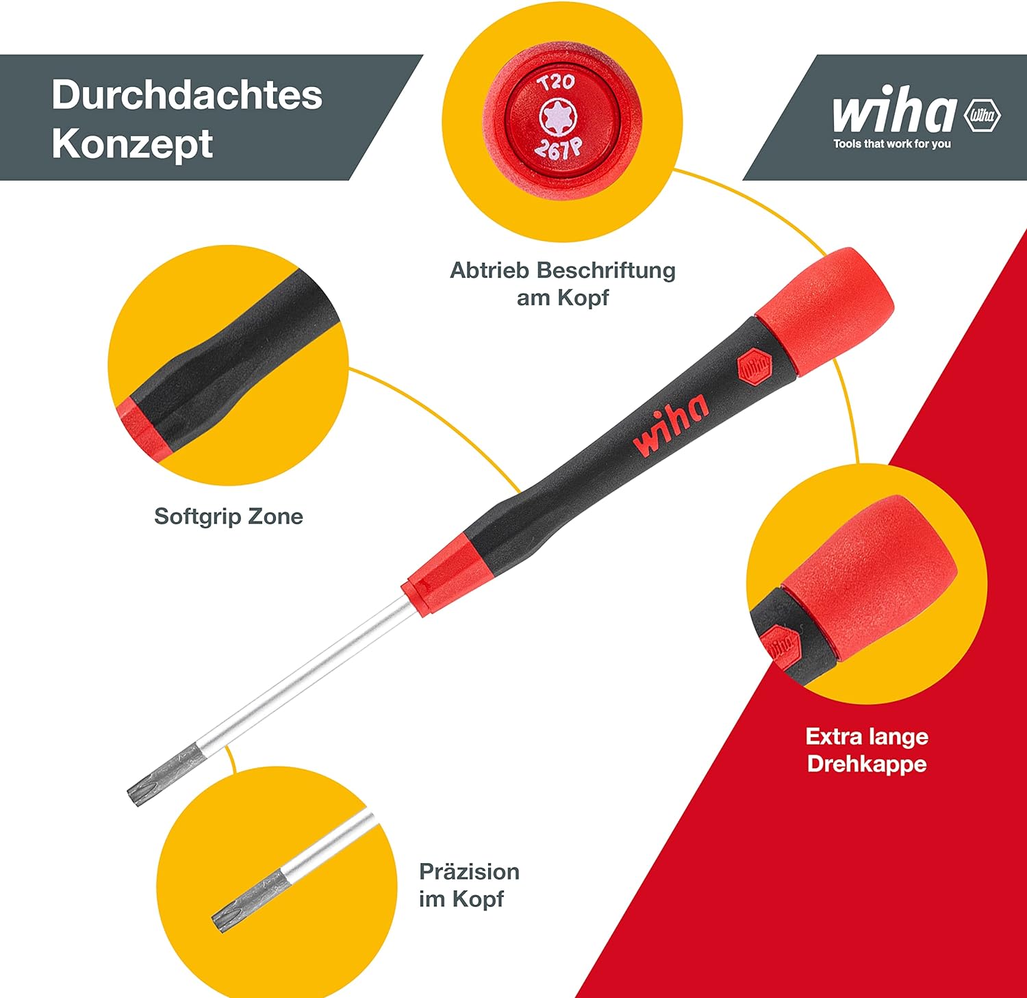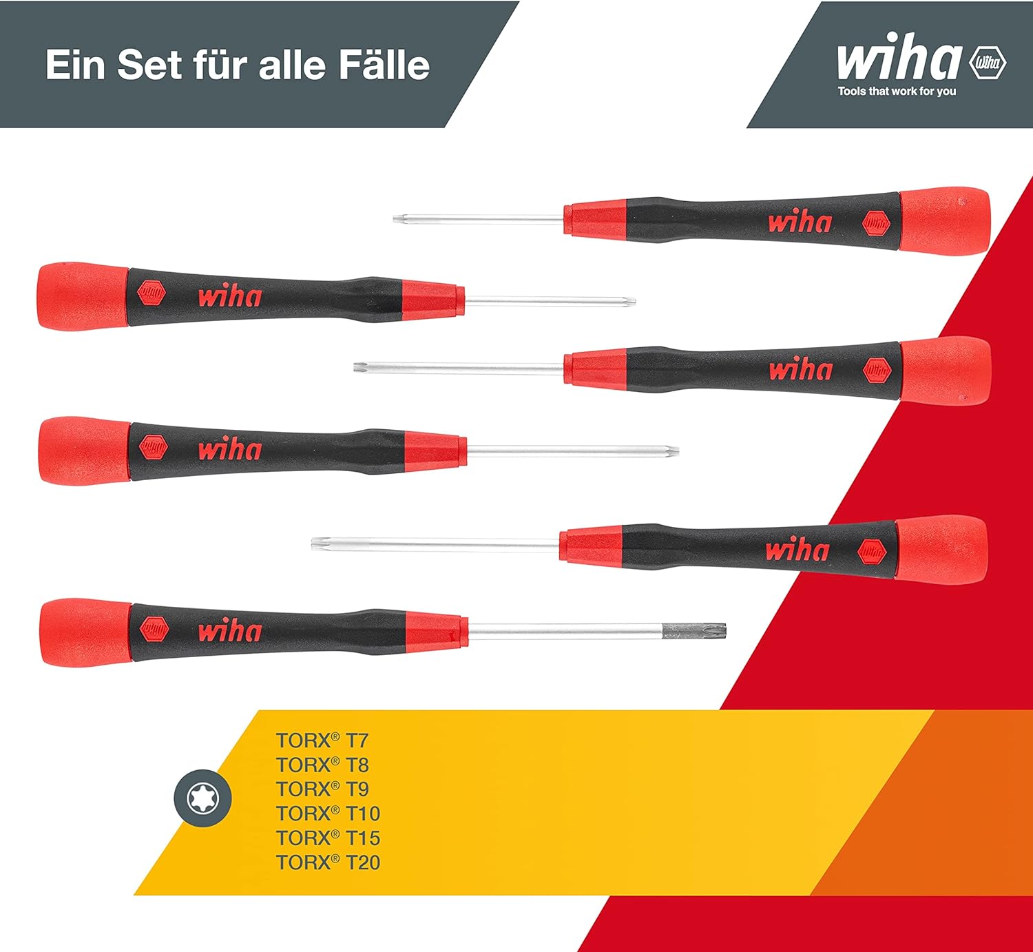 - Der durchdachte abgeflachte Griff verhindert das Wegrollen der Schraubendreher. Die Wiha MagicSpring Haltefunktion hält alle Torx Schrauben ohne Magnet fest.