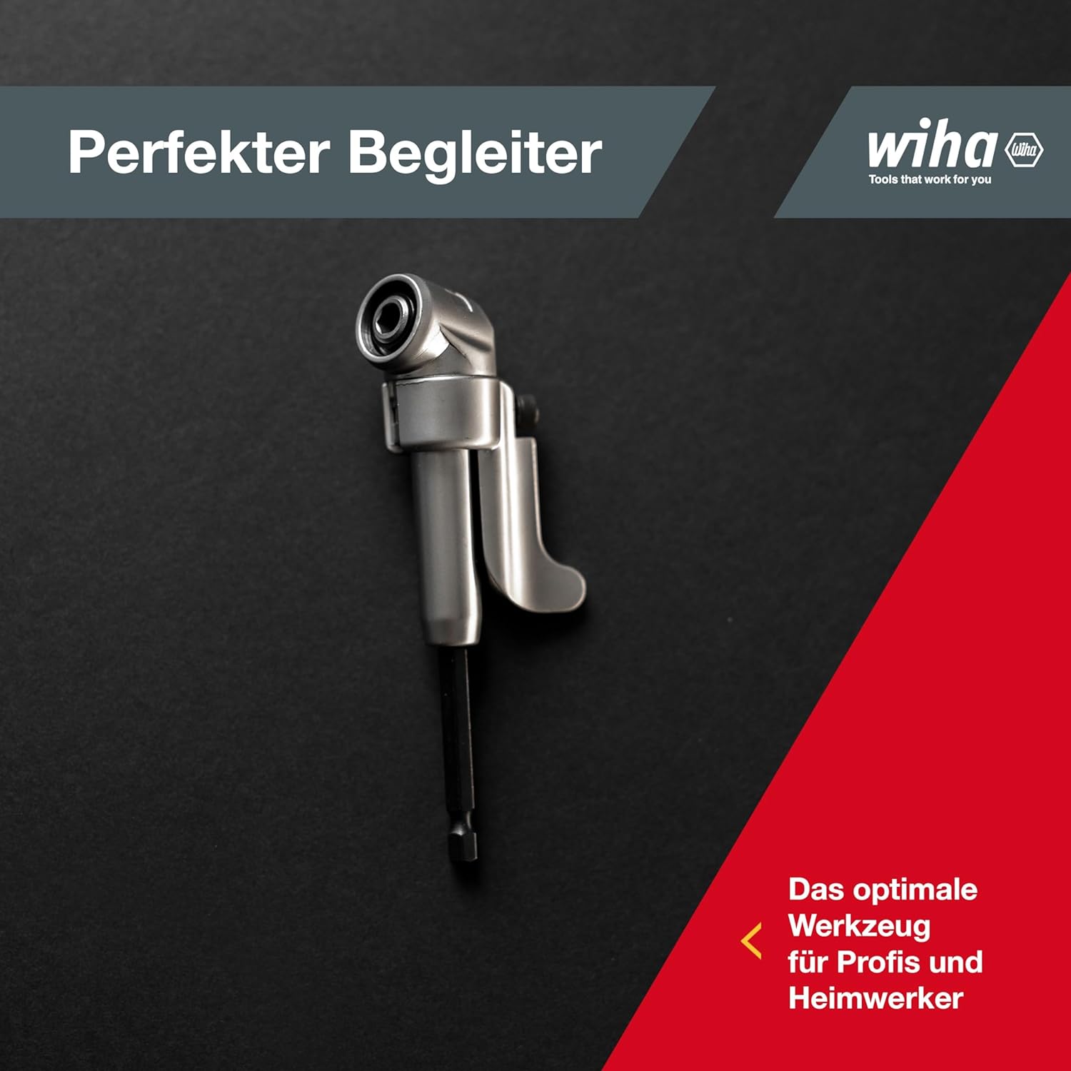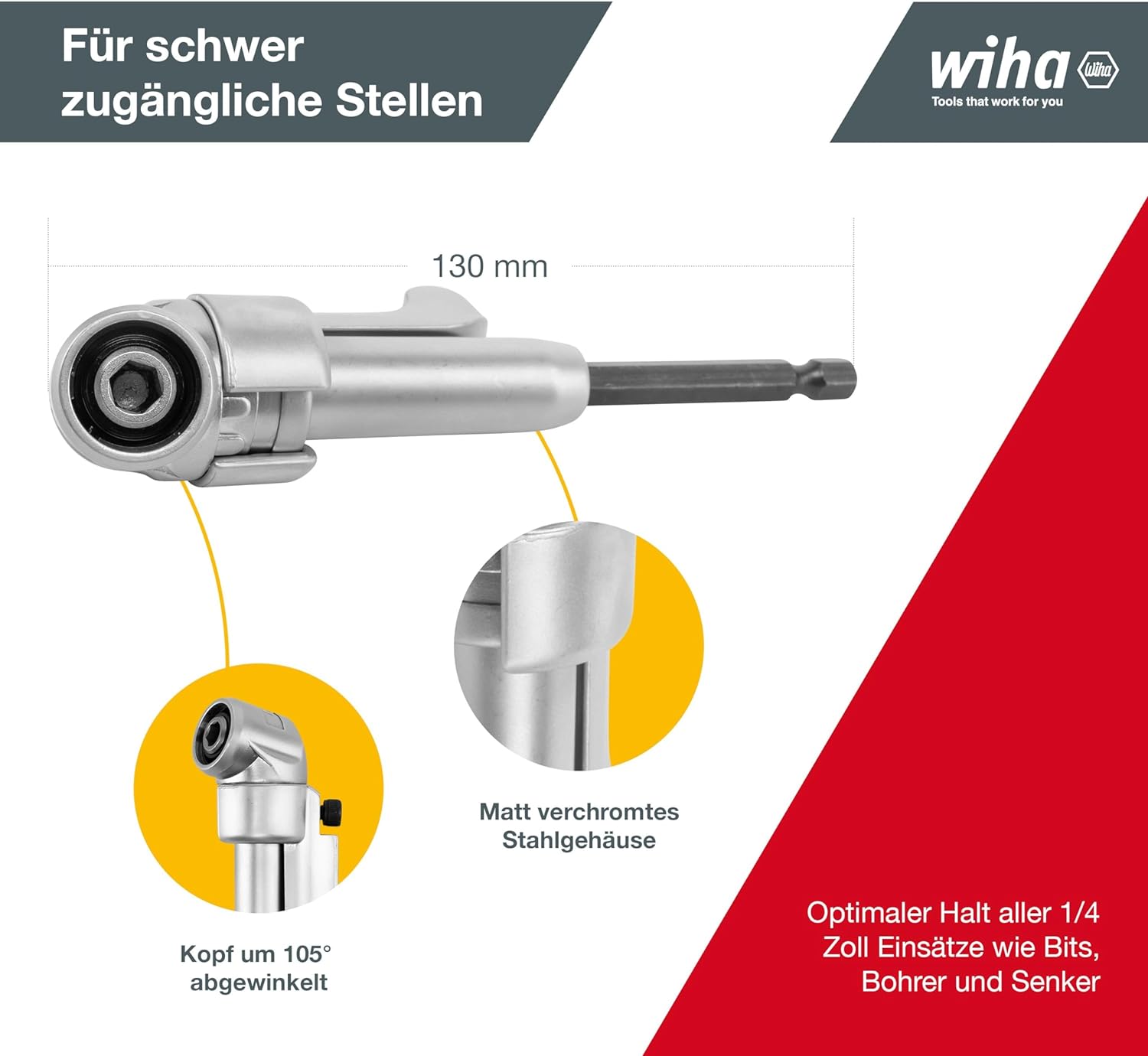 - Der Winkelschrauber Vorsatz von Wiha mit einem um 105° abgewinkelten Kopf und handbetätigter Verriegelungshülse ist ideal für schwer zugängliche Stellen, Ecken und Kanten