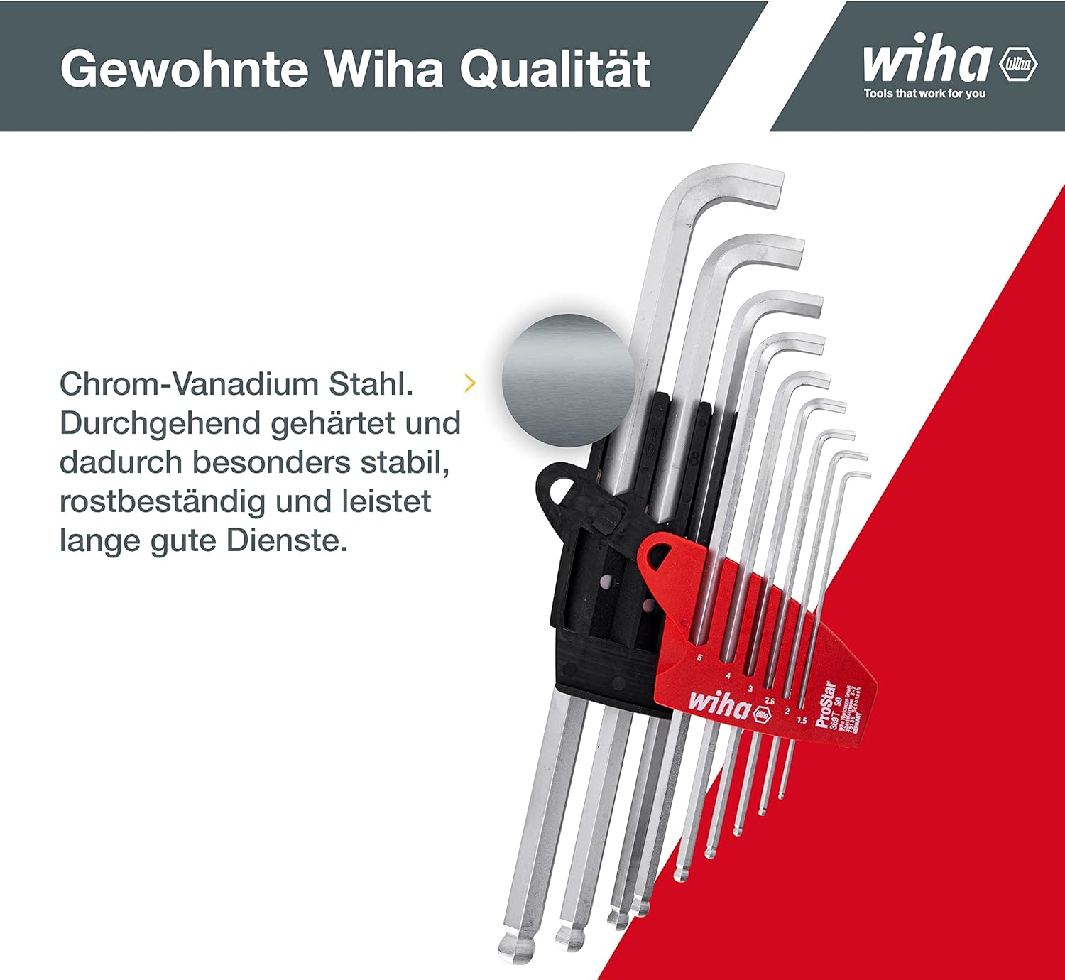 - Vertrauen Sie auf die gewohnte Wiha Qualität. Dank verwendetem Chrom-Vanadium Stahl, durchgehend gehärtet, ist der Winkelstiftschlüssel besonders stabil, rostbeständig und leistet lange gute Dienste.
