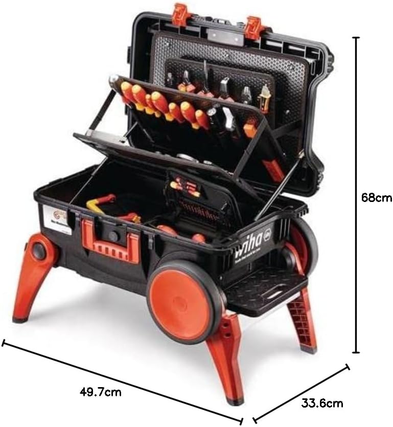 - International ausgezeichnete VDE isolierte Werkzeuge, einzeln bei 10.000 V AC getestet und zugelassen für 1.000 V AC. Auf Treppenstufen und unwegsamen Gelände rollt der Trolley-Koffer dank grosser Räder komfortabel und leichtgängig.