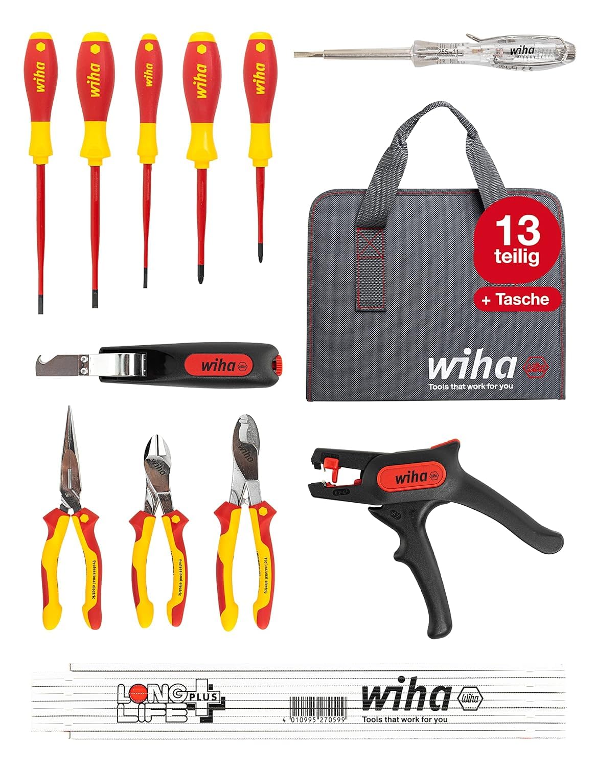 - Inhalt: 1 x Schraubendreher SoftFinish electric slimFix Schlitz (35446) 3,5 mm x 100 mm, 1 x Schraubendreher SoftFinish electric slimFix Schlitz (35501) 4,5 mm x 125 mm, 1 x Schraubendreher SoftFinish electric slimFix Schlitz (35391) 5,5 mm x 125 mm, 1 x Schraubendreher SoftFinish electric slimFix Pozidriv (35395) PZ1 x 80 mm, 1 x Schraubendreher SoftFinish electric slimFix Pozidriv (35396) PZ2 x 100 mm, 1 x Spannungsprüfer SoftFinish einpolig, 110 - 250 Volt (34745) 3,0 mm x 60 mm, 1 x Flachrundzange Professional electric mit Schneide gerade Form (26727) 200 mm, 1 x Kraftseitenschneider Professional electric mit DynamicJoint (26751) 180 mm, 1 x Kabelschneider Professional electric (34744) 200 mm, 1 x Abisolierwerkzeug automatisch bis 6 mm² in Blister (36050) 190 mm, 1 x Abmantelungswerkzeug mit selbstdrehender Schleppklinge (35969) 165 mm, 1 x Gliedermassstab Longlife 2 m metrisch, 10 Glieder (27057) weiss