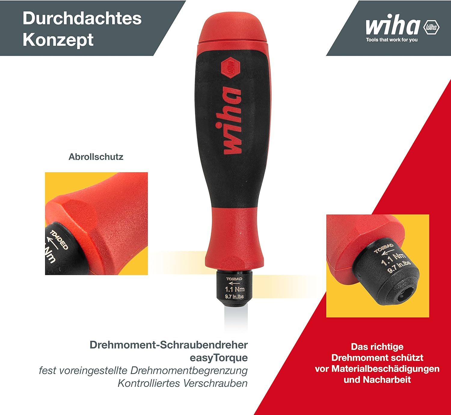 - Der fest voreingestellte Drehmoment Bithalter verfügt über einen Abrollschutz und ist rechtsauslösend.