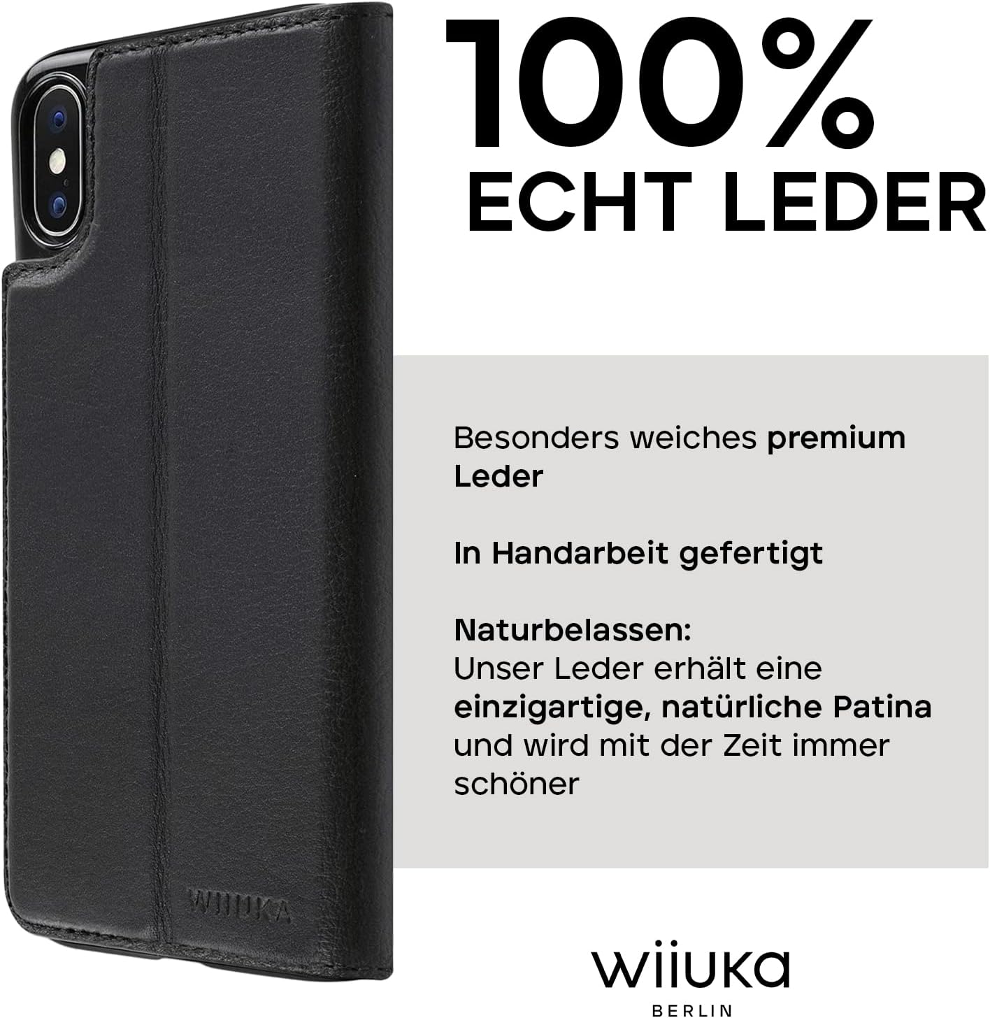 - 100% ECHT LEDER: Die WIIUKA "TRAVEL" Ledertasche im Book-Design für das Apple iPhone X und iPhone XS ist aus hochwertigem Echtleder gefertigt. Lassen Sie sich von dem angenehm dezent duftenden Leder überzeugen.