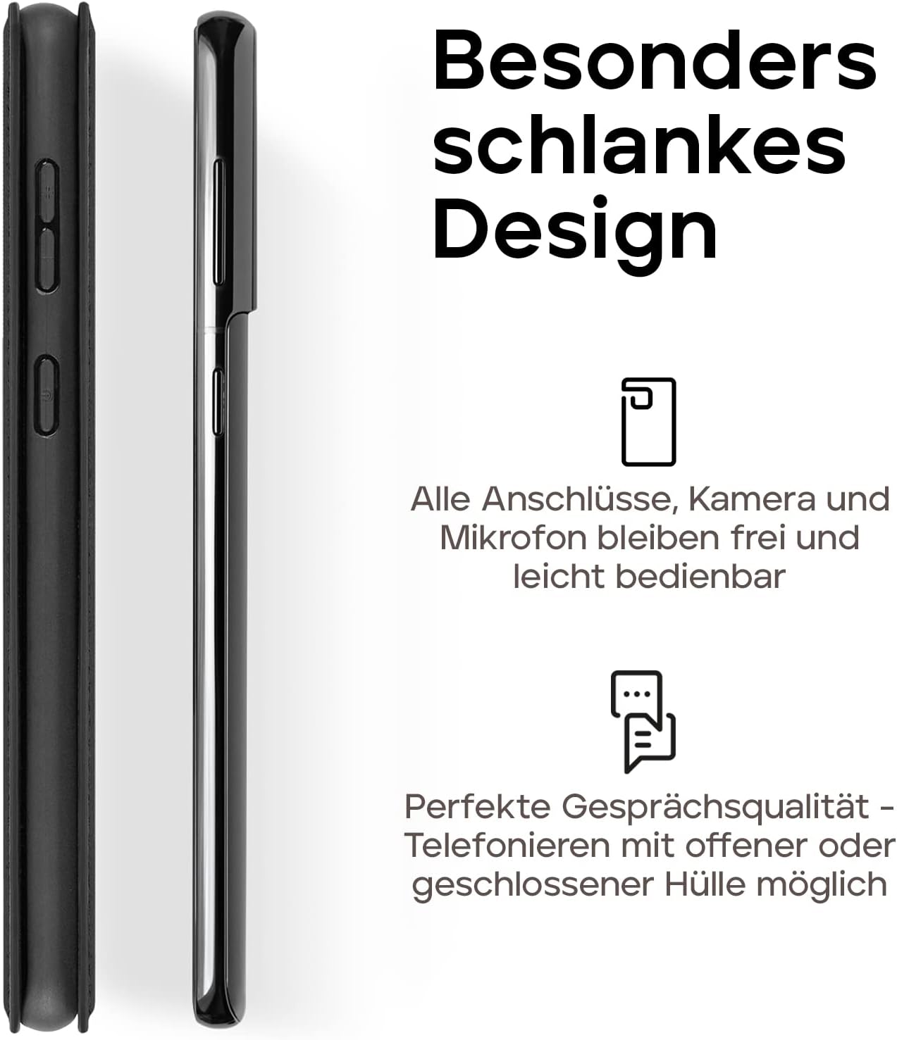 • HIGHLIGHTS: Angenehm dezent duftendes Echtleder aus Deutschland; Edles dünnes Design; 100% passgenau für Ihr Samsung S21; Innen weiches Schutzfutter gegen Kratzer und Staub; Versiegelte Nähte für eine extra Langlebigkeit; unterstützt kabelloses