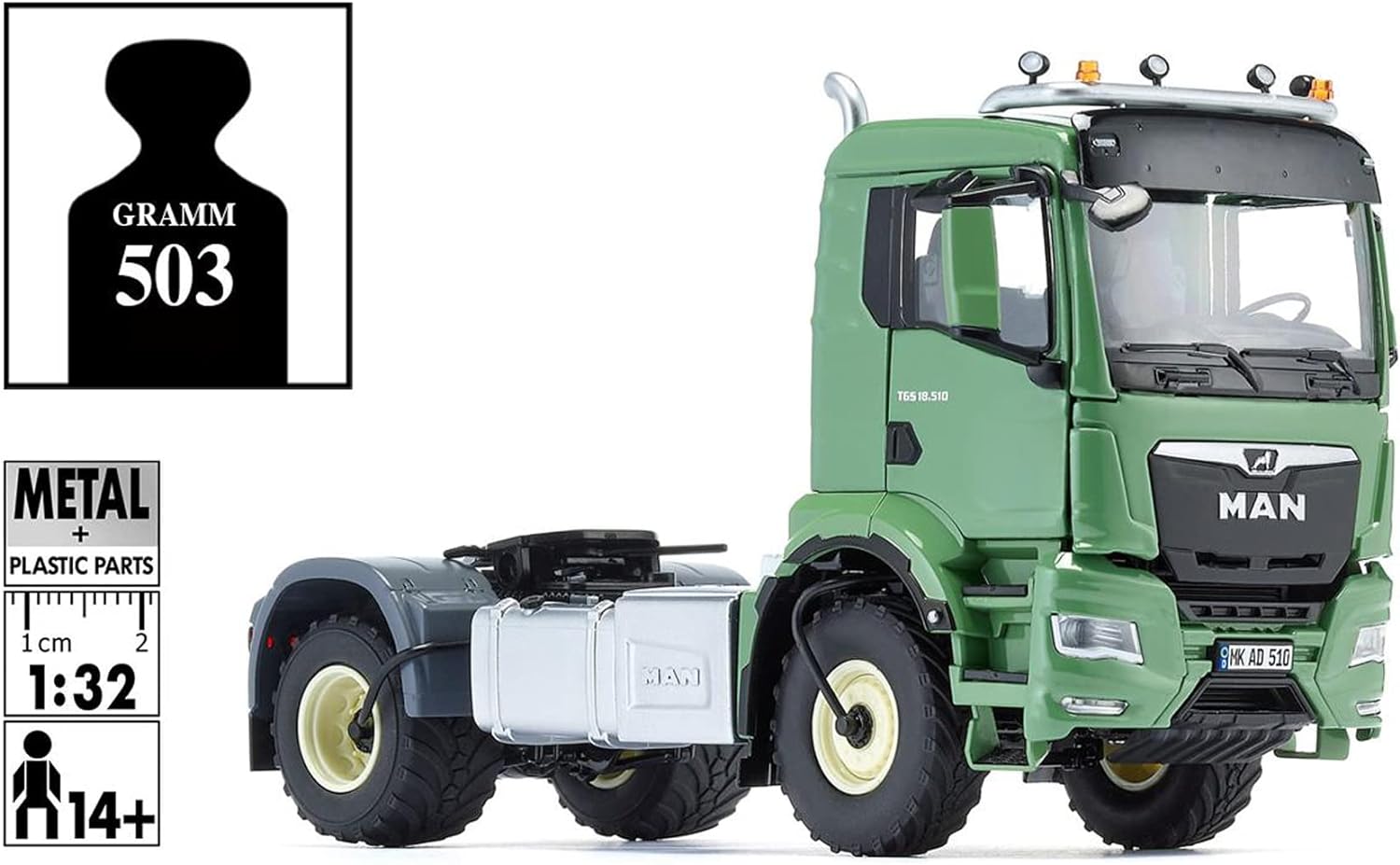 - Lieferumfang: 1x WIKING 077650 MAN TGS 18.510 4x4 BL 2-Achs Zugmaschine, Ab 14 Jahre, Massstab: 1:32, Material: Metall/Kunststoff, Masse: 19,3 x 9,1 x 10,8 cm, Gewicht: 0,503 kg, Farbe: Ackerdiesel (Grün)
