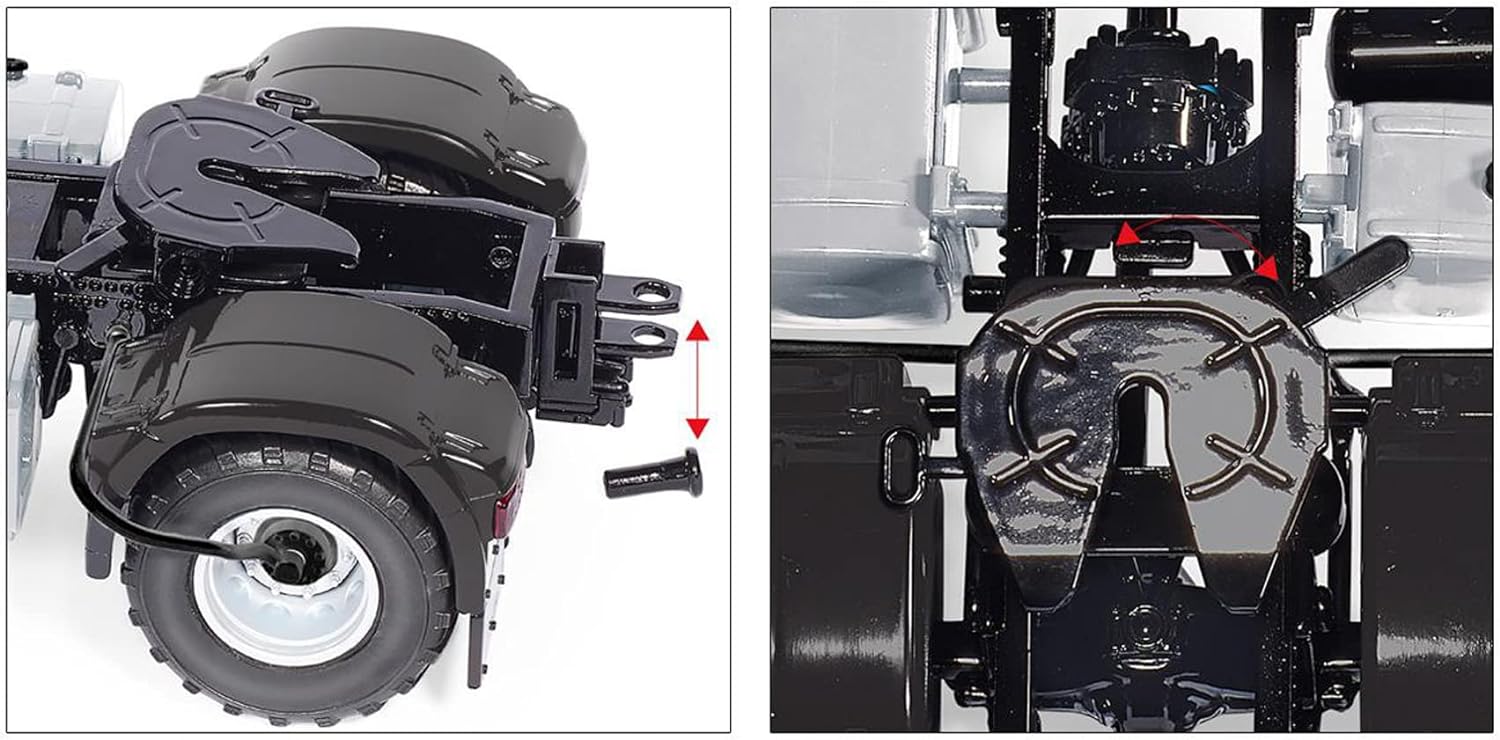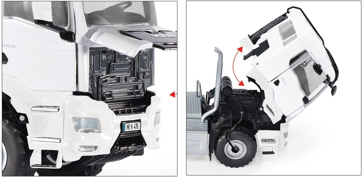 • Spass an Funktionen: Kühlergrill nach oben schwenkbar für freien Blick auf die Aggregate, Sattelplatte mit nach vorne gelagertem Hebel zum Sichern des Aufliegers, Kippbares Fahrerhaus