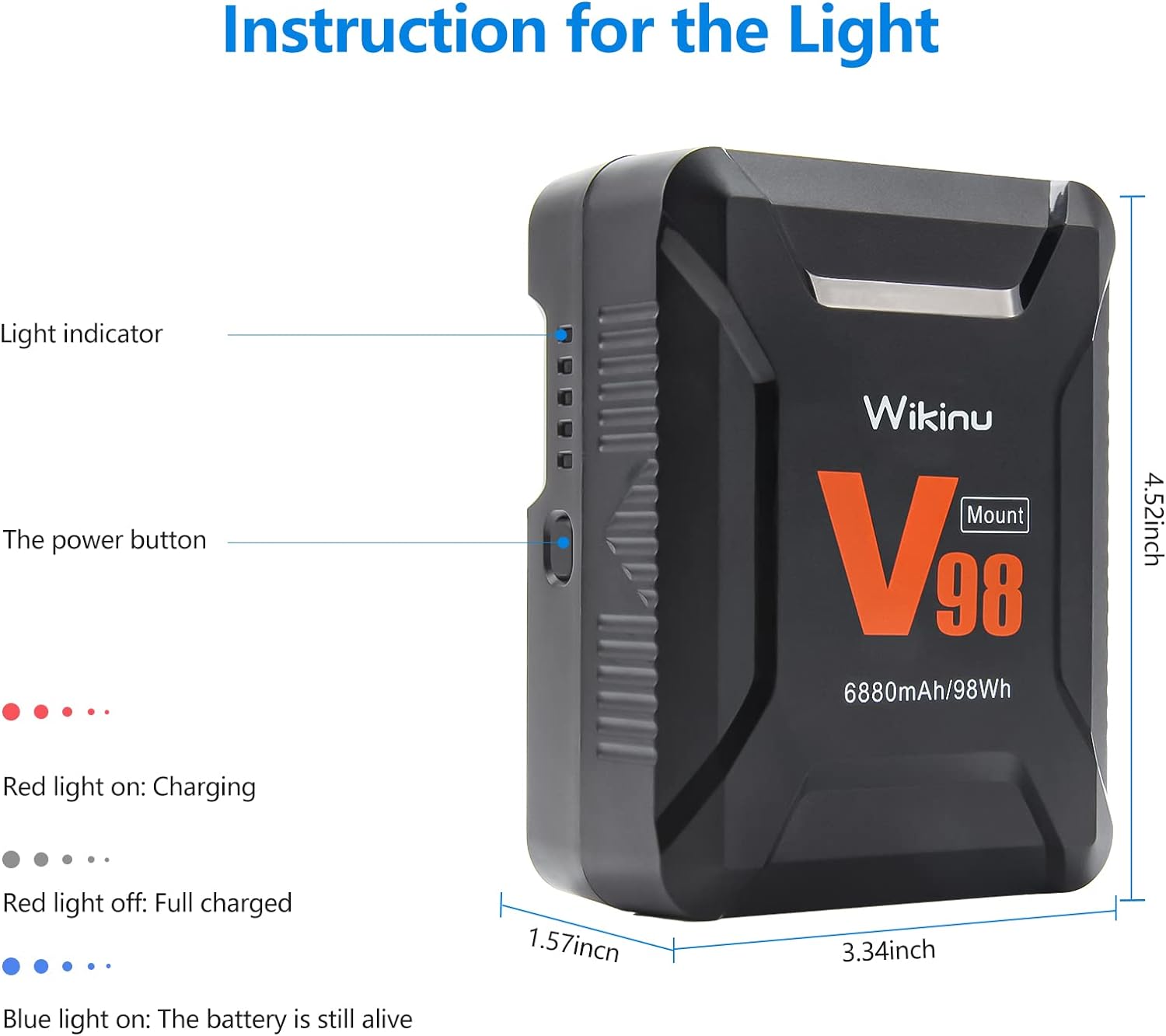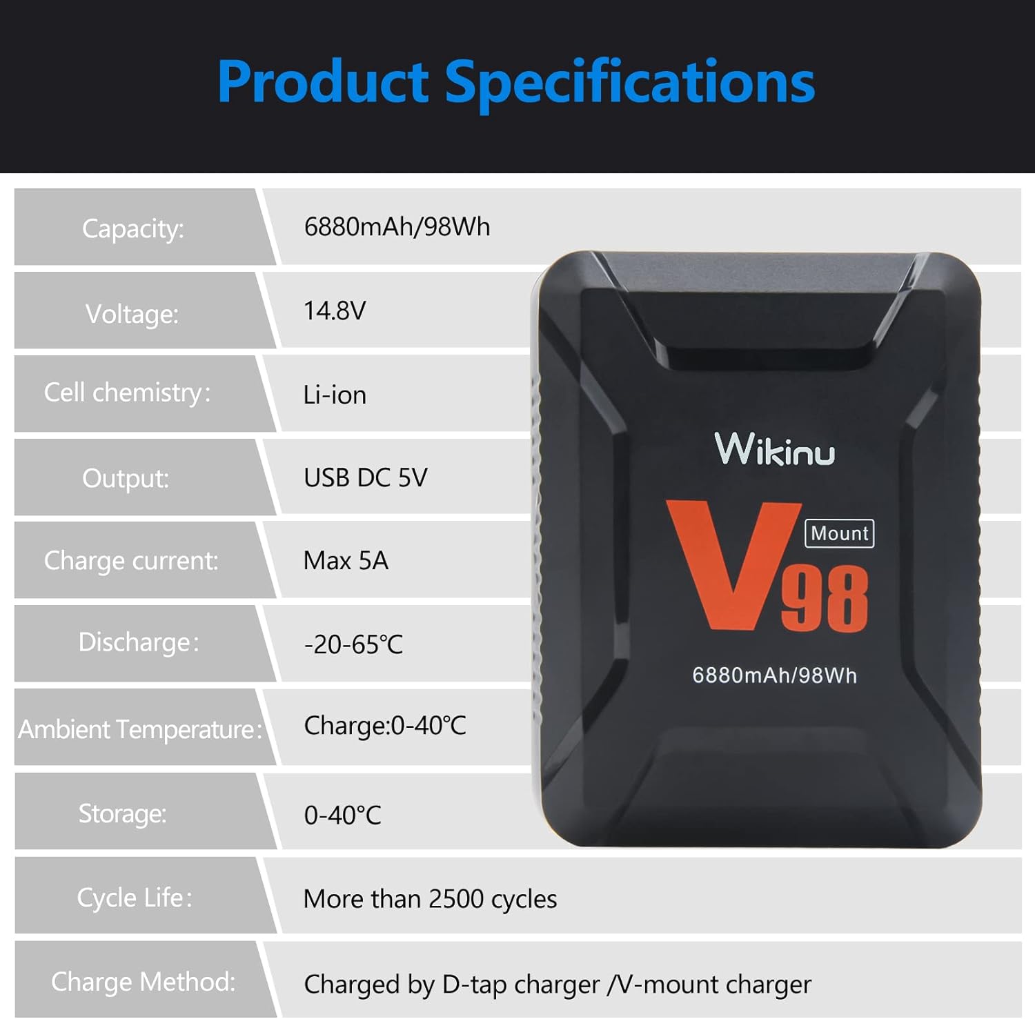 - đăEXCELLENT BATTERY QUALITYăDieser Wikinu Mini V Mount Akku hat eine Spezifikation von 98 Wh/6880 mAh und kann im tatsĂ€chlichen Gebrauch eine erstaunliche KapazitĂ€t von 115 Wh/7800 mAh erreichen! Es verzichtet auf billige Materialien, enthĂ€lt