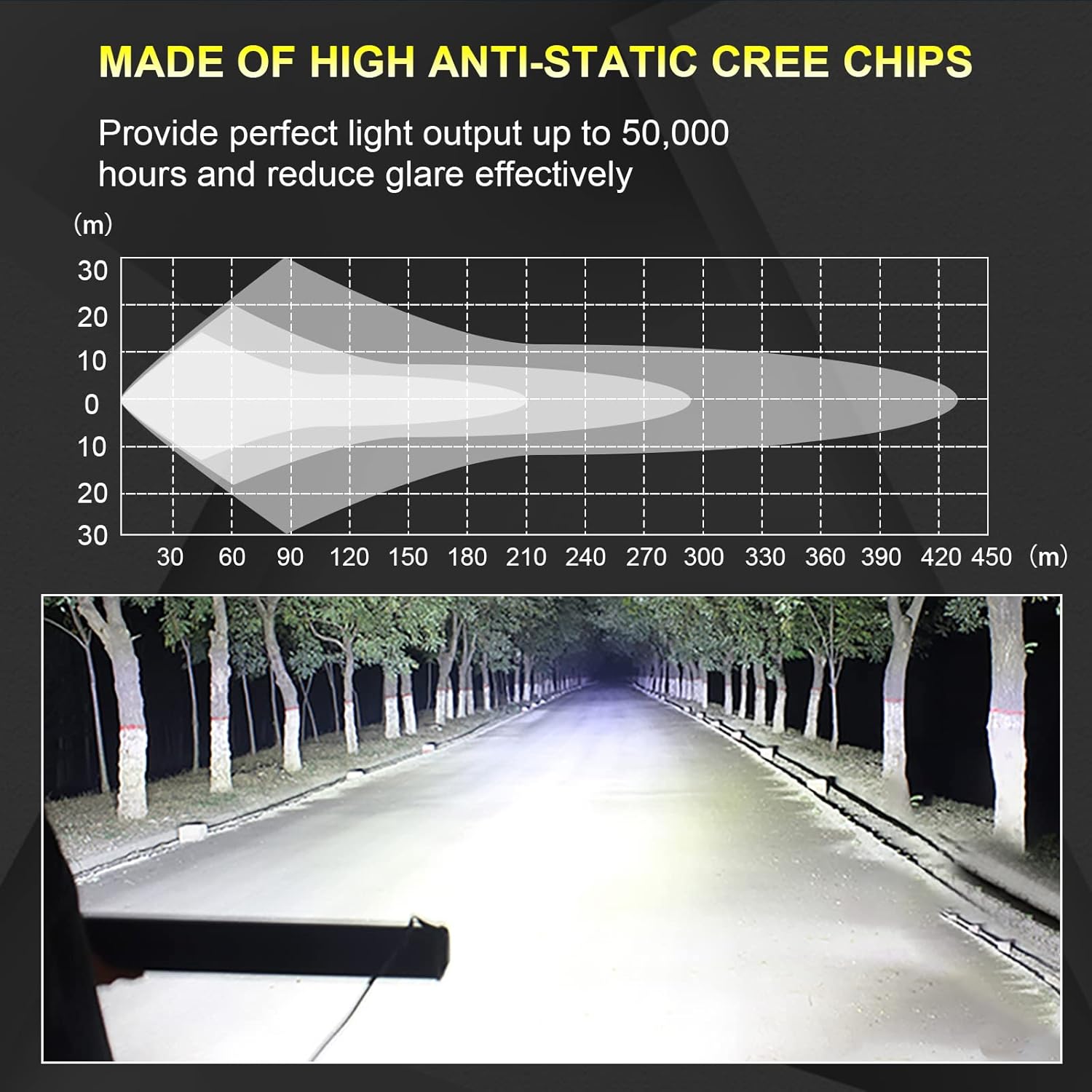 - 【Superhelle LED Bar】 Die 32 Zoll LED arbeitsscheinwerfer bar wendet leistungsstarke 405 Watt LED-Chips an, emittiert 6000k helles, kaltweisses Licht, liefert 40500lm und beleuchtet die gesamte vordere dunkle Strasse. Sie können extreme Entfernungen