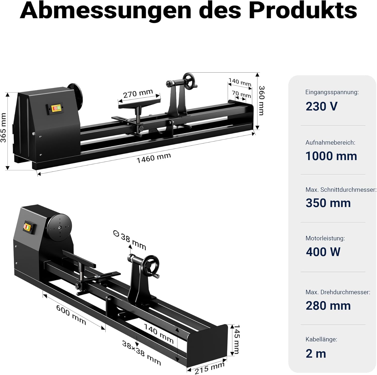 • [Umfangreiches Zubehör] - Inklusive grosser Werkzeugauflage, Stirnmitnehmer und Planscheibe für vielseitige und detaillierte Holzarbeiten.