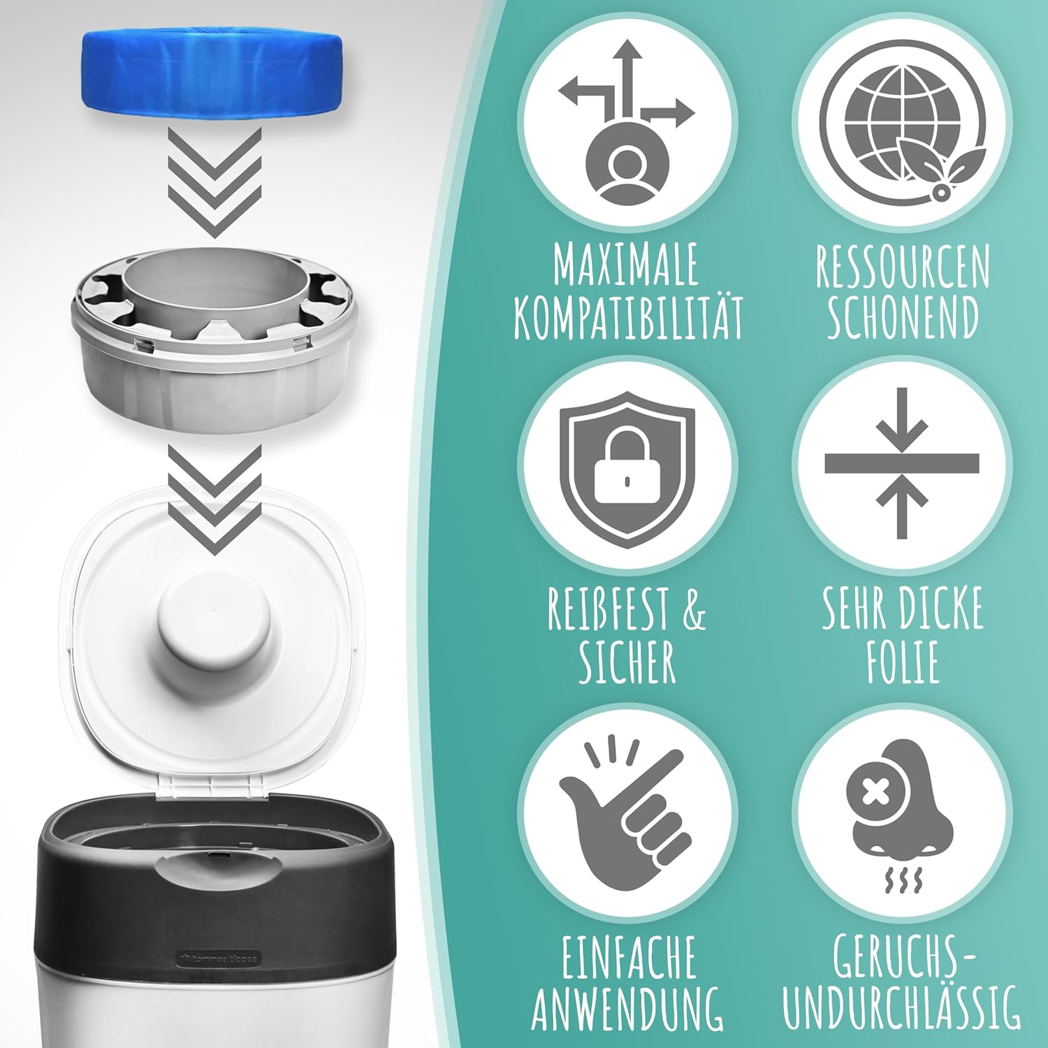 - ✅UNIVERSELL KOMPATIBEL - Die extra-dicke Folie eignet sich für runde & achteckige Windelmülleimer-Modelle, ob Tommee Tippee Twist & Click, Sangenic Tec, Littycat Diaper Pails, Sprout oder Chicco!