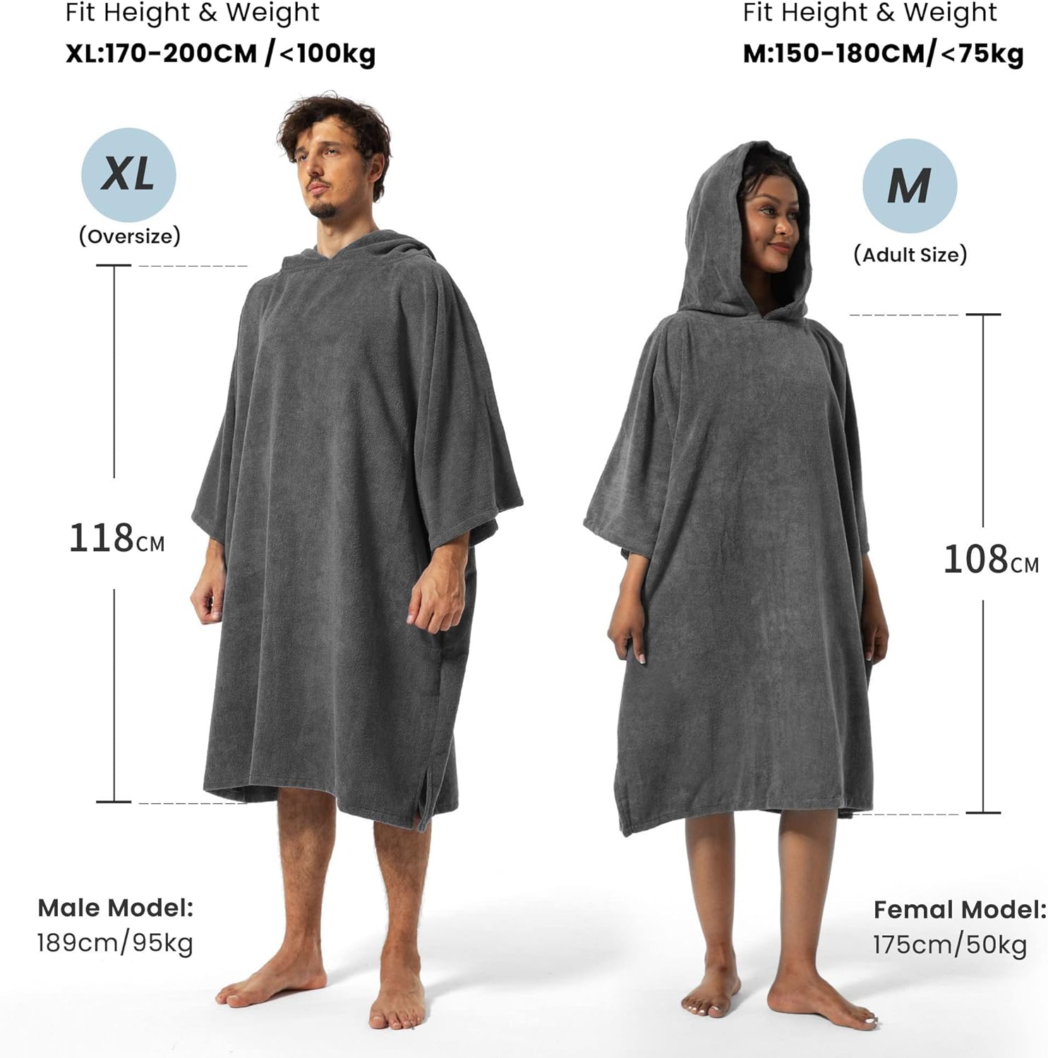 • EINFACHER-- Surf poncho frottee Erhältlich in zwei Universalgrössen M(Empfohlene Höhe:150cm-180cm)/XL(Empfohlene Höhe:170cm-200cm), passend für alle Erwachsenen, nach Gebrauch einfach in die Waschmaschine stecken.