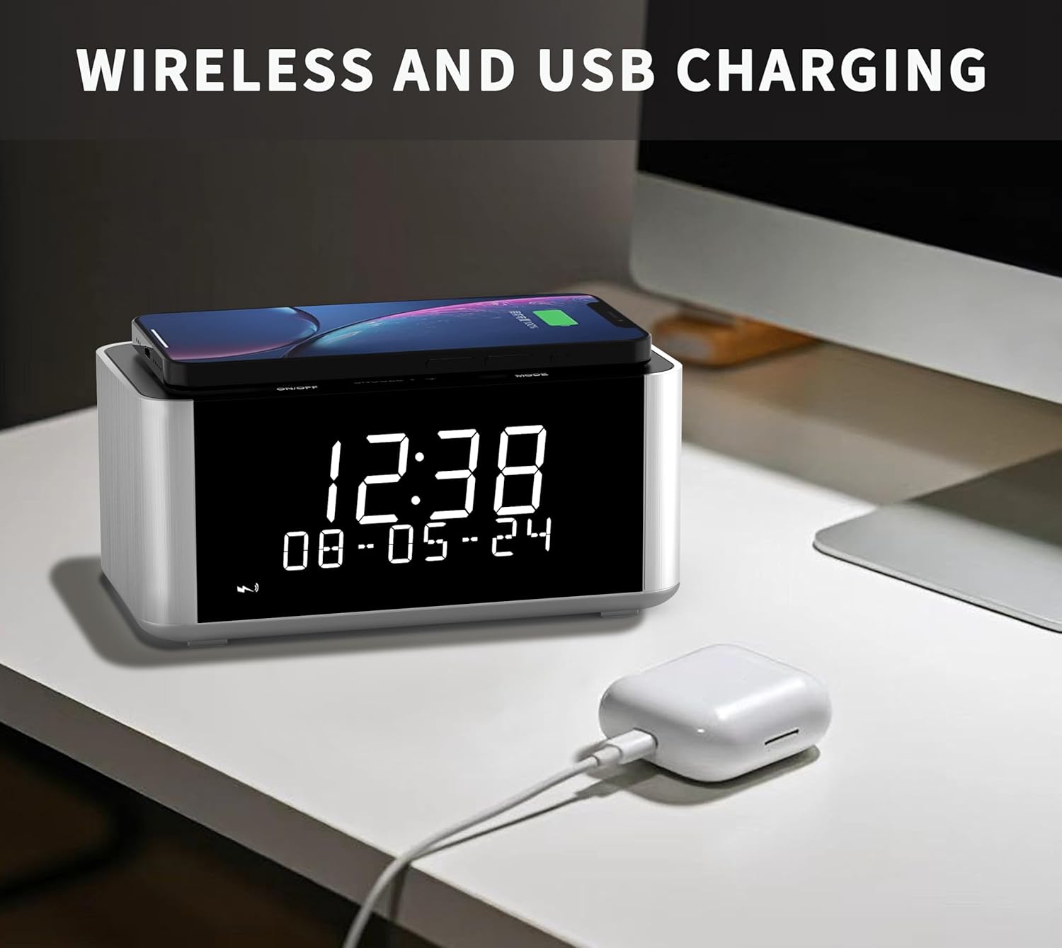 - KONVENTIERT WIRELESS LADEN: 5W drahtlose Ladeuhr bietet effizientes Laden. Laden Sie kompatible Geräte wie Smartphones und Smartwatches auf. Legen Sie Ihr Telefon einfach auf das Ladepad, um mit dem Aufladen zu beginnen, keine Kabel erforderlich