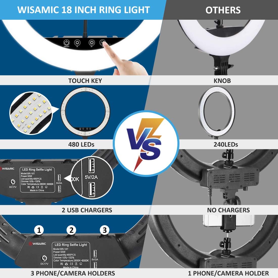 • *2 USB-Ladegeräte und 3 Handyhalterungen: für Ihre Bequemlichkeit ist der Wisamic LED Ringlicht mit 2 USB-Ladeanschlüssen und 3 Handyhalterungen ausgelegt. Keine Sorge über niedrigen Stromverbrauch. Sie können auch Mehrkanal-Webcast gleichzeitig