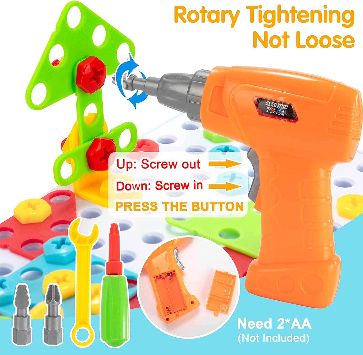 - 237 teiliges Bauset: Enthält verschiedene Farben und Formen von Mosaik-Puzzlebrettern, Pilzstifte und Schrauben, Wendedrehbohrer (benötigt 2 AA-Batterien, nicht im Lieferumfang enthalten), Schraubendreher, Schraubenschlüssel.