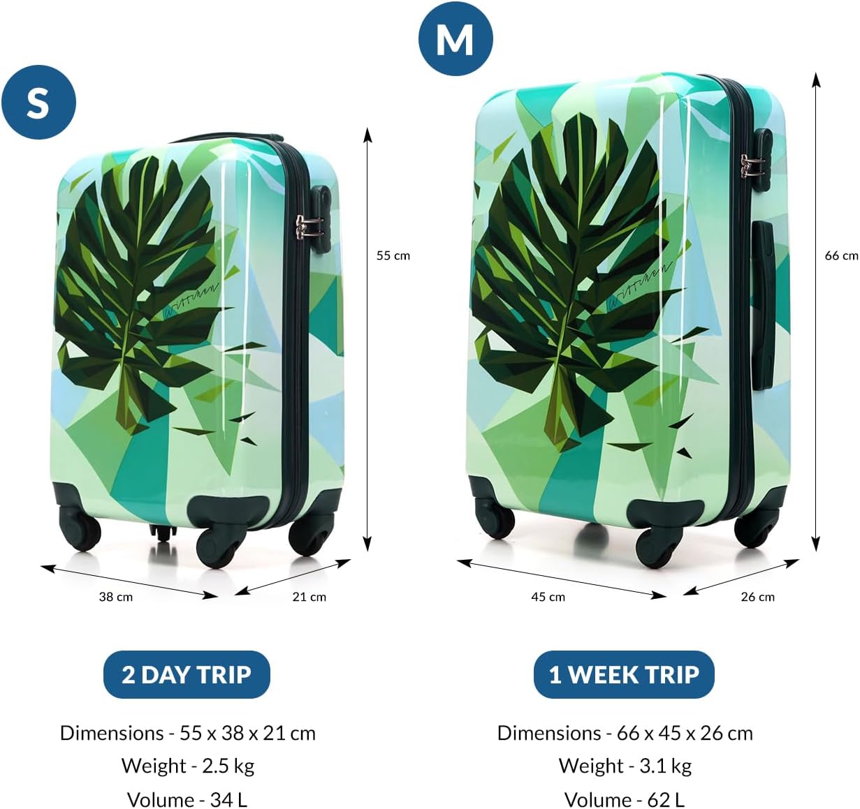 • ABMESSUNGEN: Kleiner: (H x B x T): 55 x 38 x 21, Gewicht: 2,5 kg, Volumen: 34 L; Mittlerer: 66 x 45 x 26, Gewicht: 3,1 kg, Volumen: 62 L; Kosmetikkofer: 32 x 30 x 17, Gewicht: 1 kg, Volumen: 14,5 L. Die Abmessungen umfassen auch Aussenteile wie Griffe