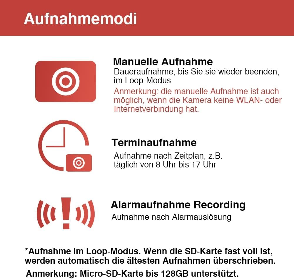 - [Daueraufnahmen im Loop-Modus und weitere Optionen] Die Kamera unterstützt Daueraufnahmen im Loop-Modus (erfordert Mikro-SD-Karte, nicht im Lieferumfang enthalten). Auch ohne WLAN oder Internet kann die Kamera weiter aufzeichnen. Die Kamera kann als Digitalkamera im Auto, am Fahrrad oder bei anderen Outdoor-Aktivitäten verwendet werden. Weitere Aufnahmemodi: Alarmaufnahme, Terminaufnahme (täglich feste Zeiten).