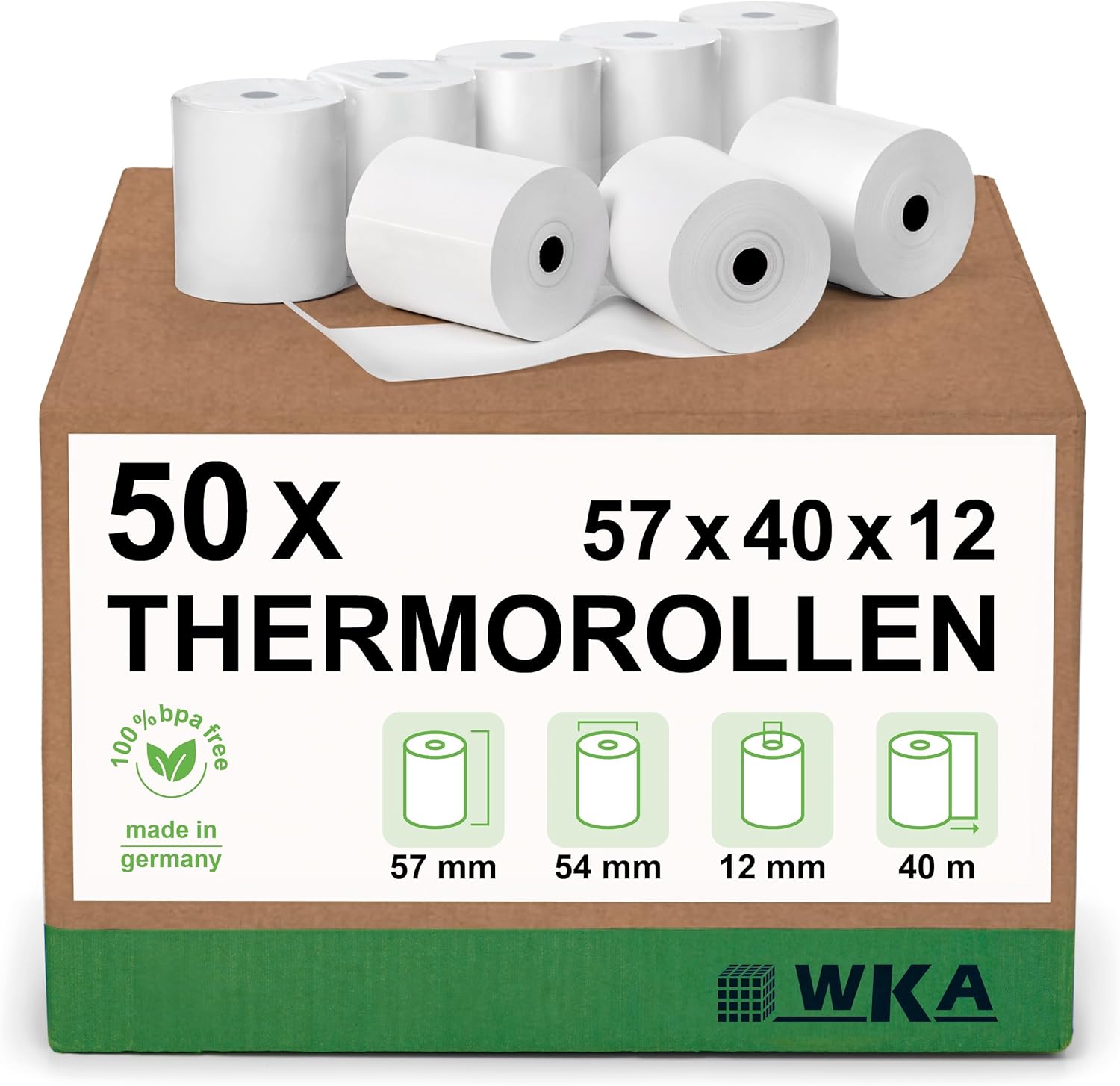 - Es handelt sich um 50 Stück Thermorollen mit den Abmessungen 57 mm (Breite) x 40m (Lauflänge) x 12 mm (Innenkern), der Durchmesser beträgt 55 mm