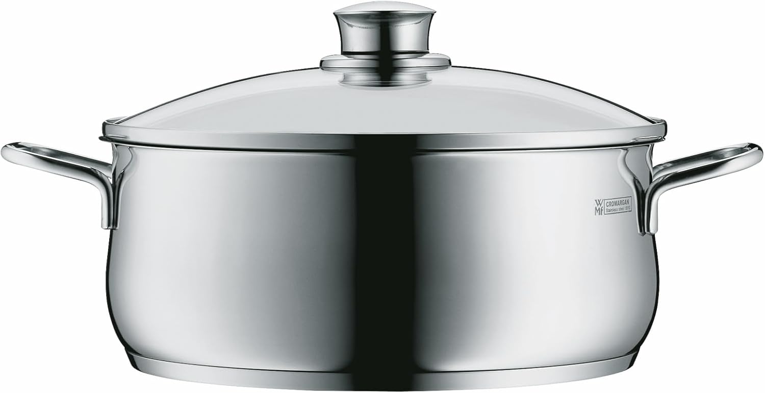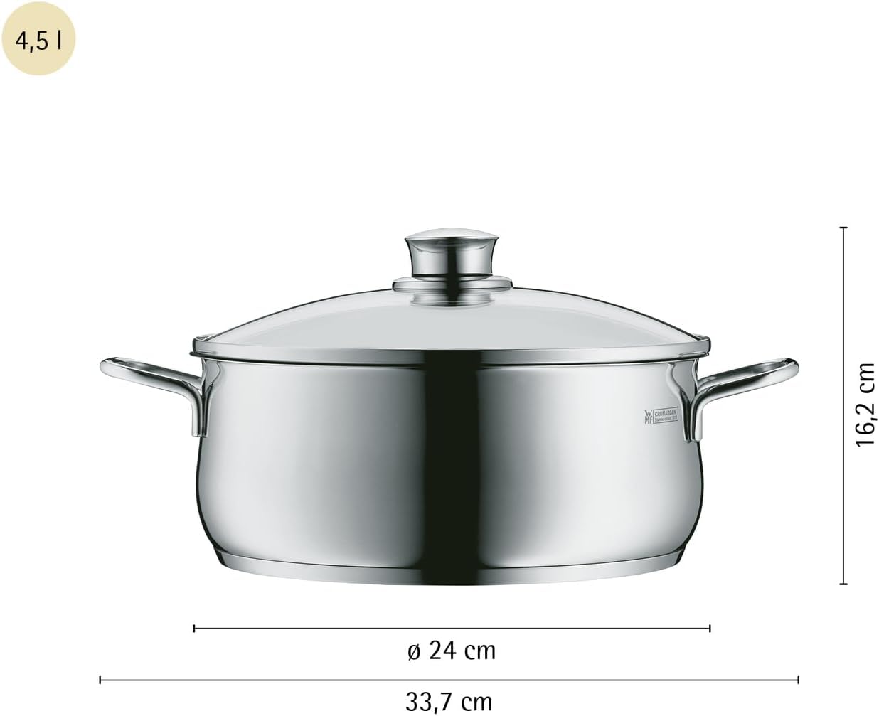 - Material: Cromargan Edelstahl 18/10, poliert, unbeschichtet - rostfrei, spülmaschinengeeignet, backofengeeignet bis 250°C (mit Deckel 180°C). Glas