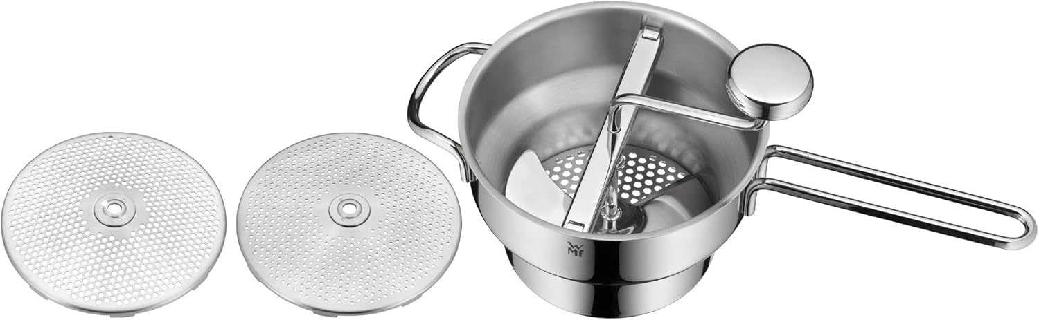 - Inhalt: 1x Passiermühle (Ø 19 cm, Höhe 11,5 cm), 3x Lochscheibe (Ø 14 cm) zum Passieren und Reiben von Obst und Gemüse (2mm, 3 mm, 5 mm) - passend für Töpfe ab Ø 19 cm - Artikelnummer: 0605639990