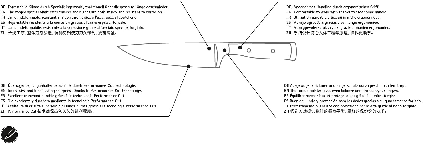 - Performance Cut: die Klinge wird in einem Spezialofen wärmebehandelt. Das Härteverfahren und ein lasergesteuerter Roboterschliff sorgen für einen optimalen Schleifwinkel. Das Messer bleibt länger scharf