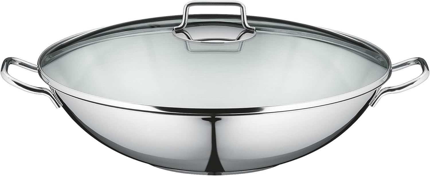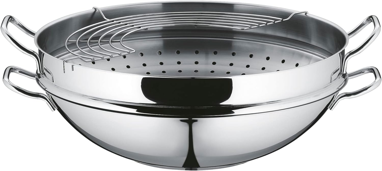 • Inhalt: 1x Wok-Pfanne 36 cm (Volumen 4,5l, Höhe 9,75 cm)- optimal für Herdplatten mit Ø 22 cm, 1x Glasdeckel, 1x Ablagegitter, 1x Dämpfereinsatz, 1x Rezeptheft - Artikelnummer: 0792566040