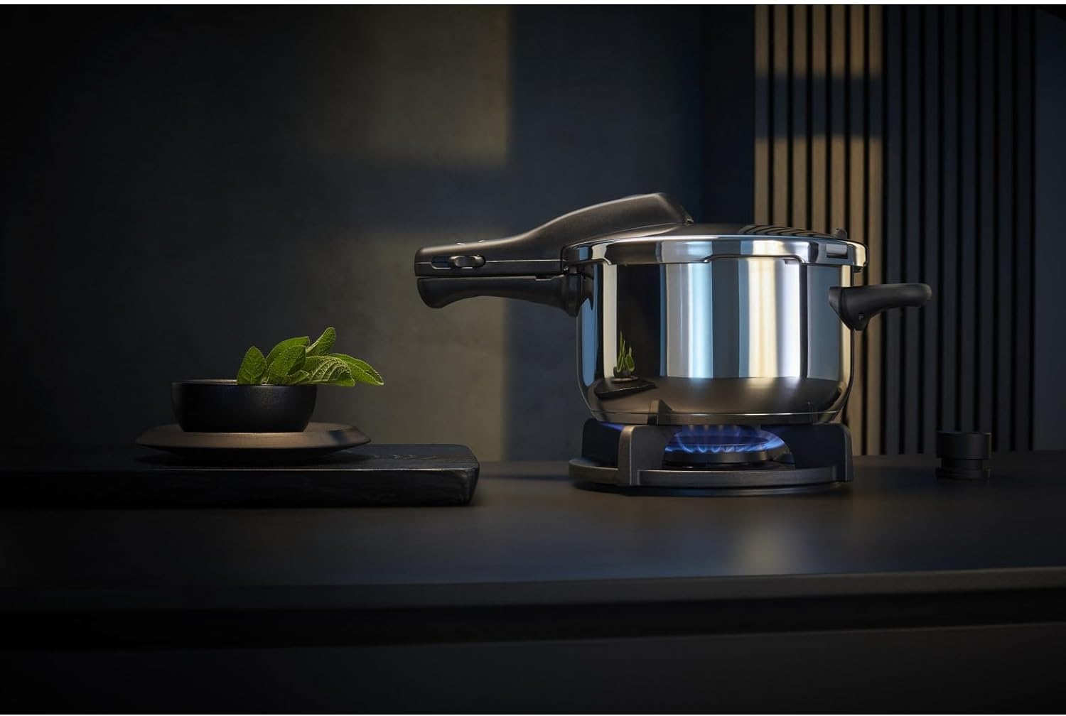• Extrasicher: 5-stufiges, TÜV-geprüfte Sicherheitssystem mit Abdampfautomatik. Der kleine Pin ist eine sichtbare Restdruckanzeige und lässt den Topf erst öffnen, wenn er komplett verschwunden ist