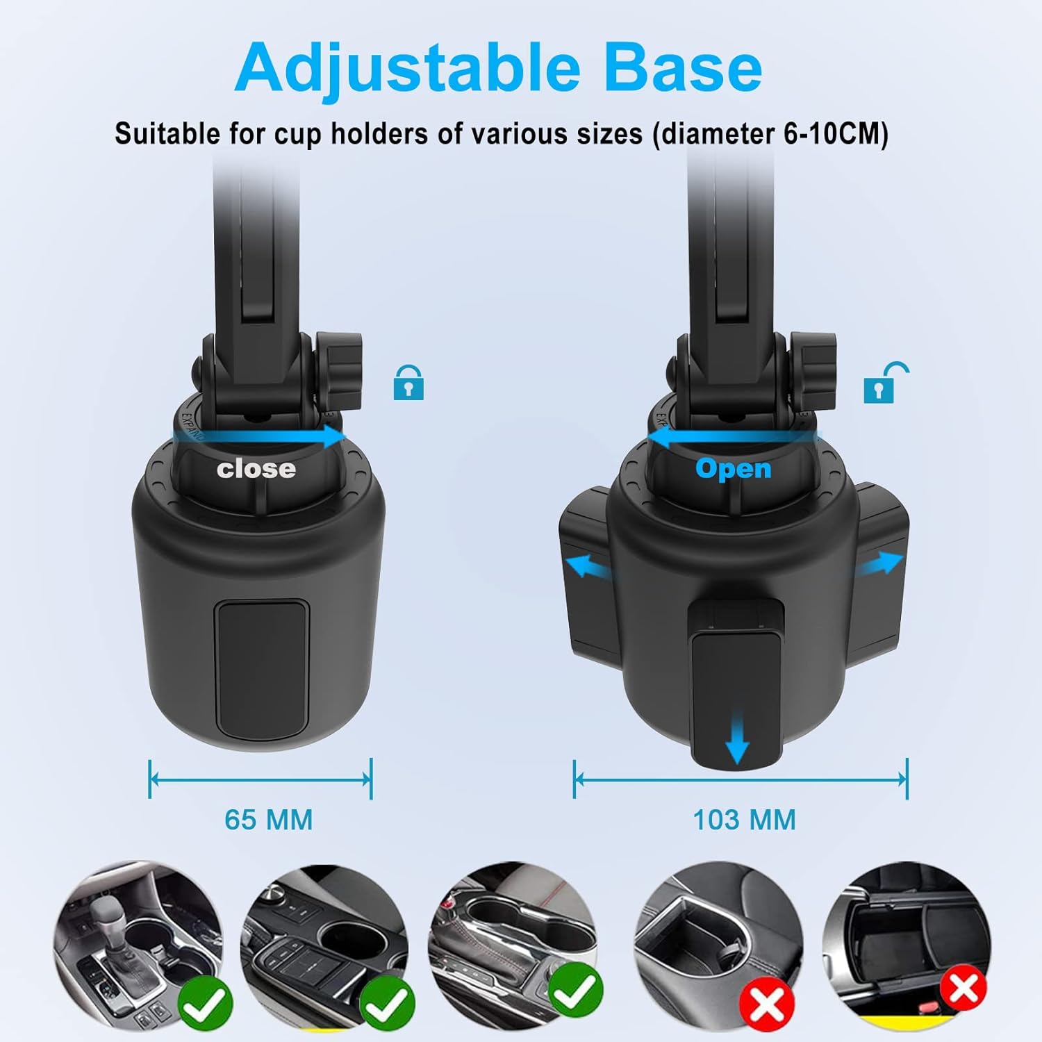 - 【Verbesserte, breitere, erweiterbare Basis】Die verbesserte, verstellbare Basis kann von 65 mm auf 103 mm verlängert werden, um in alle Getränkehalter im Auto zu passen. Mit den weichen, rutschfesten Silikonpolstern und dem strapazierfähigen