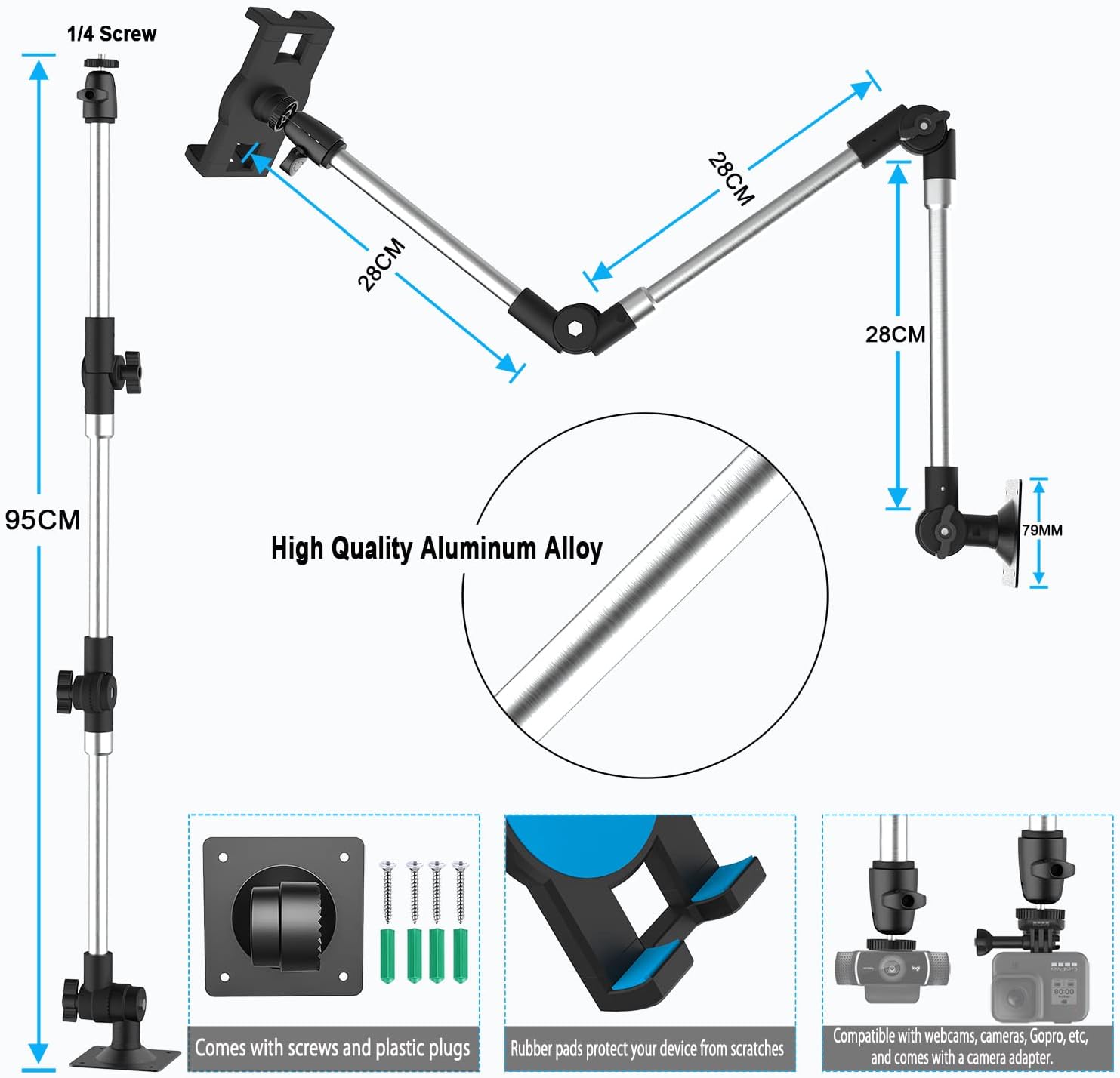 - 【Flexibel und einstellbar】faltbarer metallarm wand tablet halter mit 3 Abschnitten 28cm Arme, Gesamtlänge 95cm, der Boden kann um 360 Grad gedreht werden, alle Verbindungspunkte können aus mehreren Winkeln eingestellt werden, können Sie jeden
