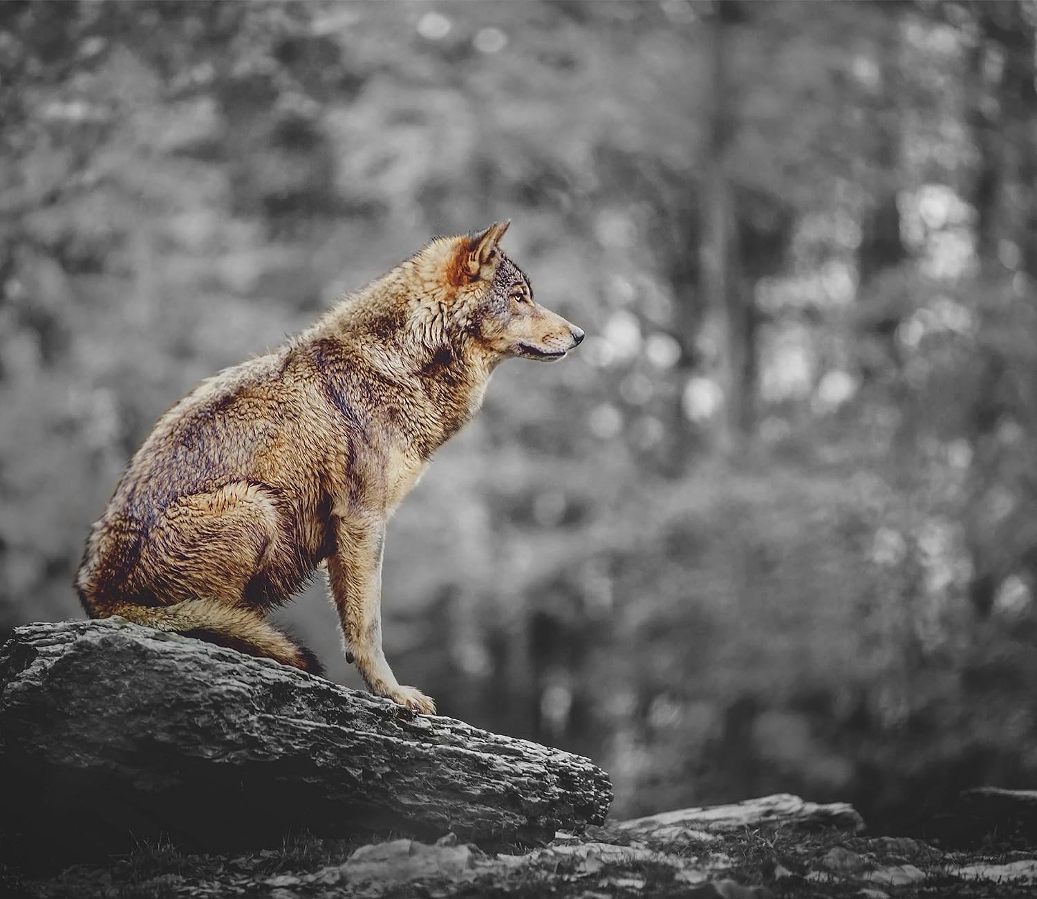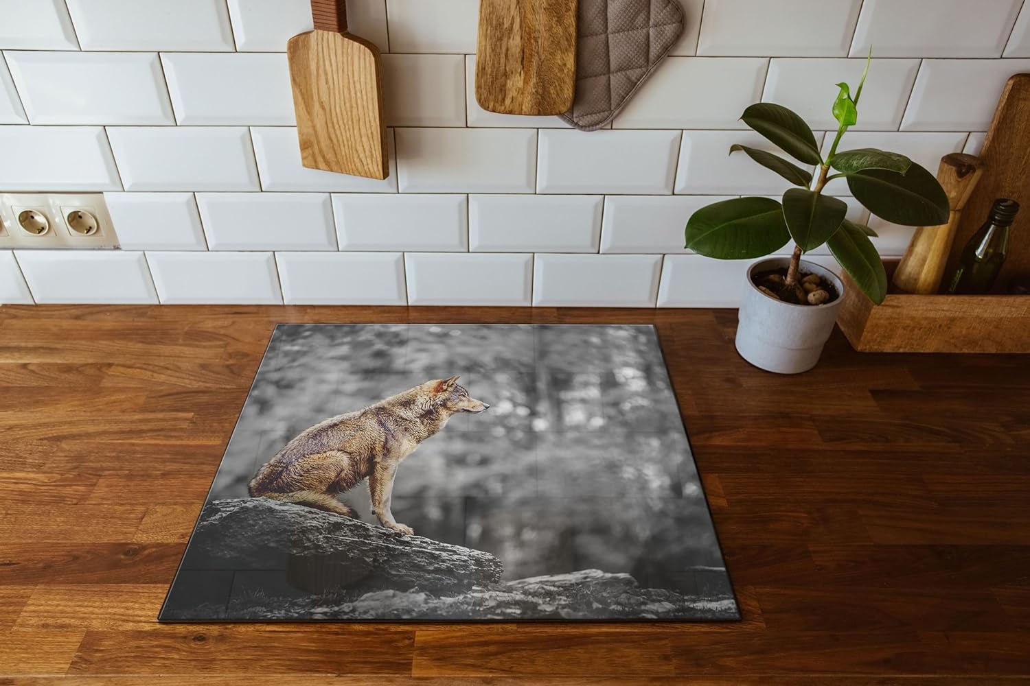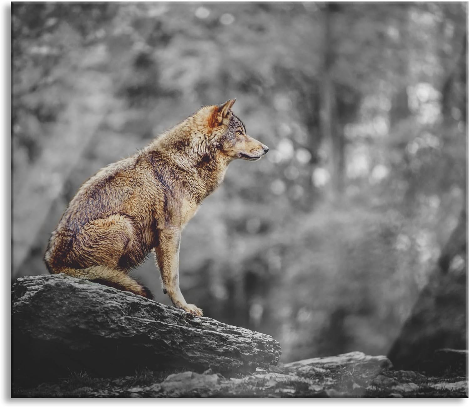 Wolf sitzt auf einem Stein im Herbstwald B&W Detail Herdabdeckplatte & Spritzschutz aus Echtglas | F