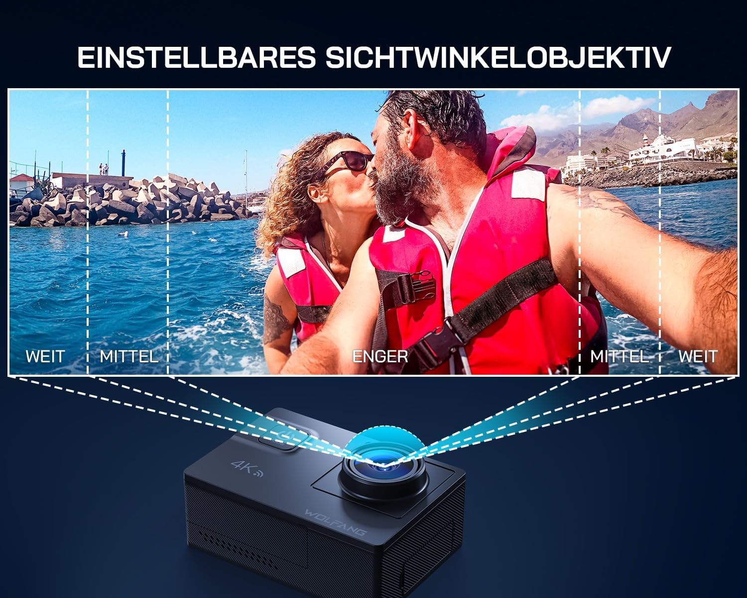 - 🎞️【4K/60FPS Video & 20MP Foto】Die WOLFANG GA300 Action Kamera ist eine native 4K-Kamera, die eine Videoauflösung von bis zu 4K bei einer Bildrate von 60 Bildern pro Sekunde bietet, um alle Details Ihres Abenteuers festzuhalten. Die Auflösung von Fotoaufnahmen kann bis zu 20 MP erreichen, was die Aufnahmeszene klar reproduziert und das schöne Bild im Moment der Aufnahme einfriert.