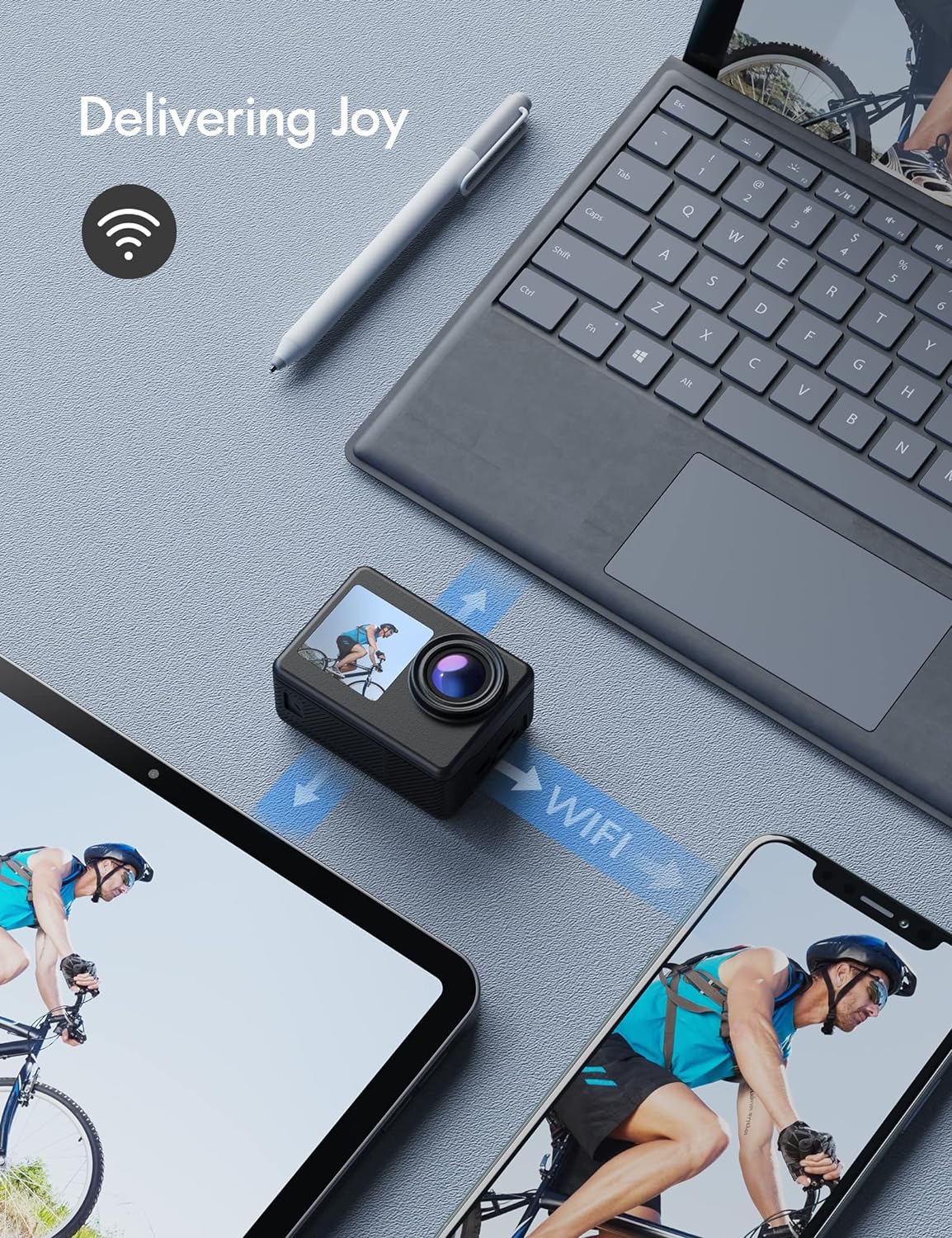 • [Zweifarbiger Bildschirm] Die Sportkamera WOLFANG GA200 verfügt über ein fortschrittliches zweifarbiges Bildschirmdesign. Sie können zwischen Vorder- und Rückbildschirm wechseln. Der lebendige Frontbildschirm ist für Ihre Selfie-Anforderungen