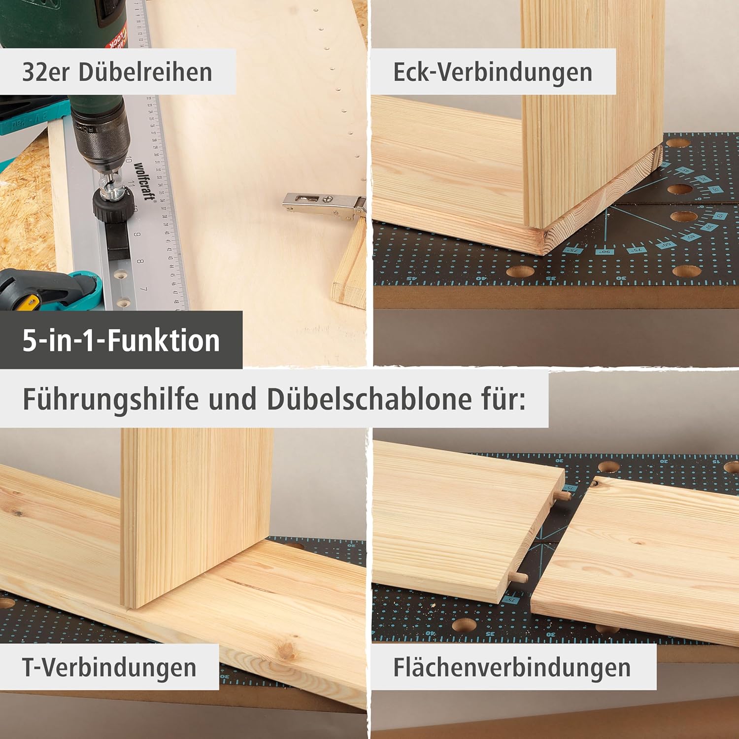 - Lieferumfang: 1 x Dübelleiste von wolfcraft / Flexibel verstellbar - ideal für Einlegeböden, Regalböden und Türen / Bohrlehre zum Erstellen einer Lochreihe / Für 5mm, 6mm, 8mm und 10mm Bohrer