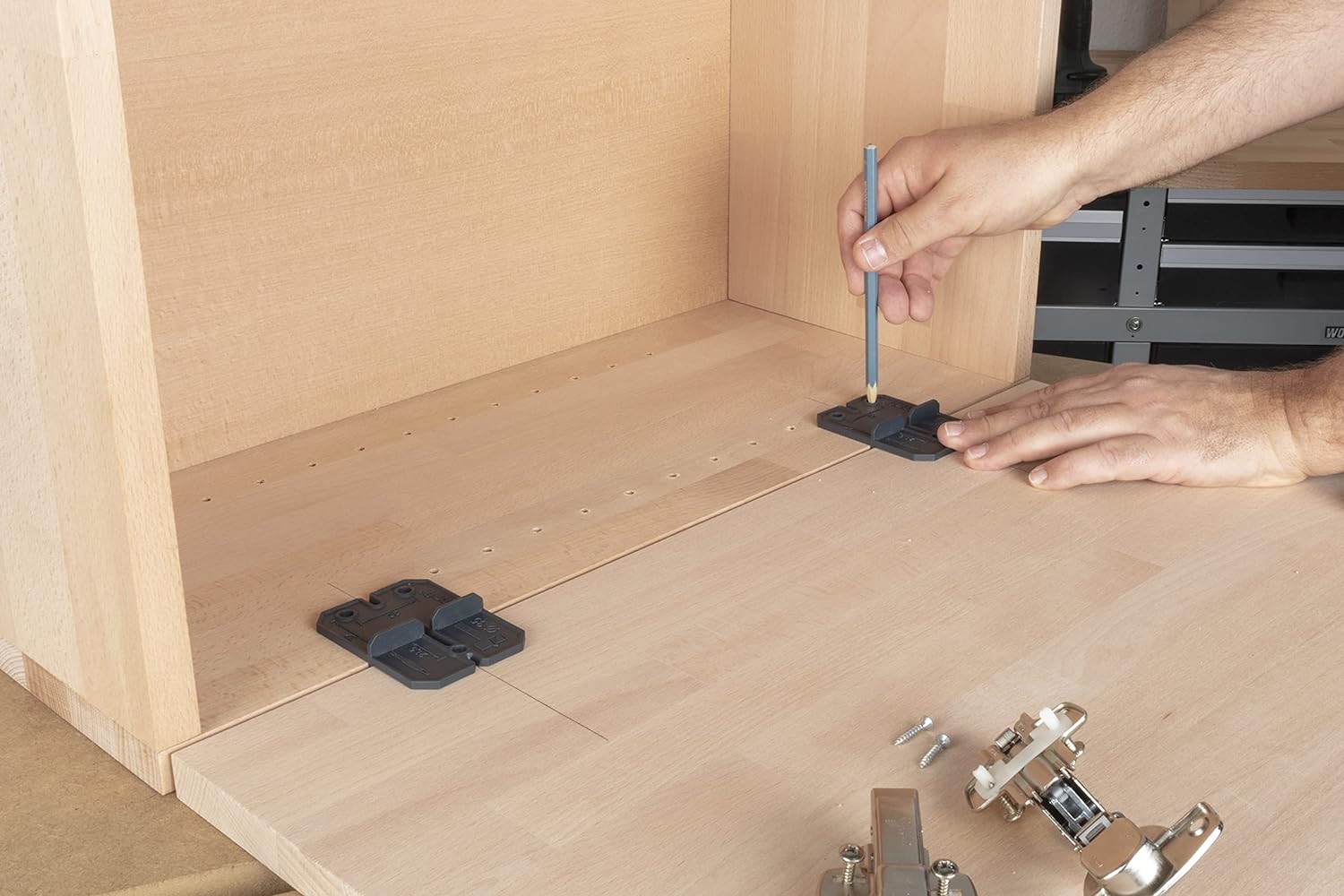 • 5-tlg. Set aus 2 Bohrschablonen, Forstnerbohrer Ø 26 mm, Zentrierbohrer Ø 2,5 mm, Holzspiralbohrer Ø 5 mm für die einfache Installation von Topfscharnieren