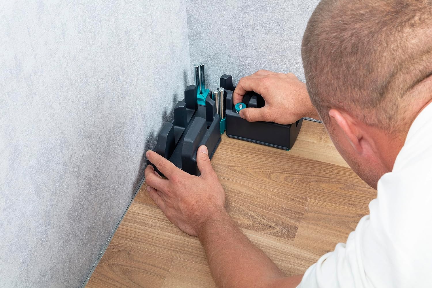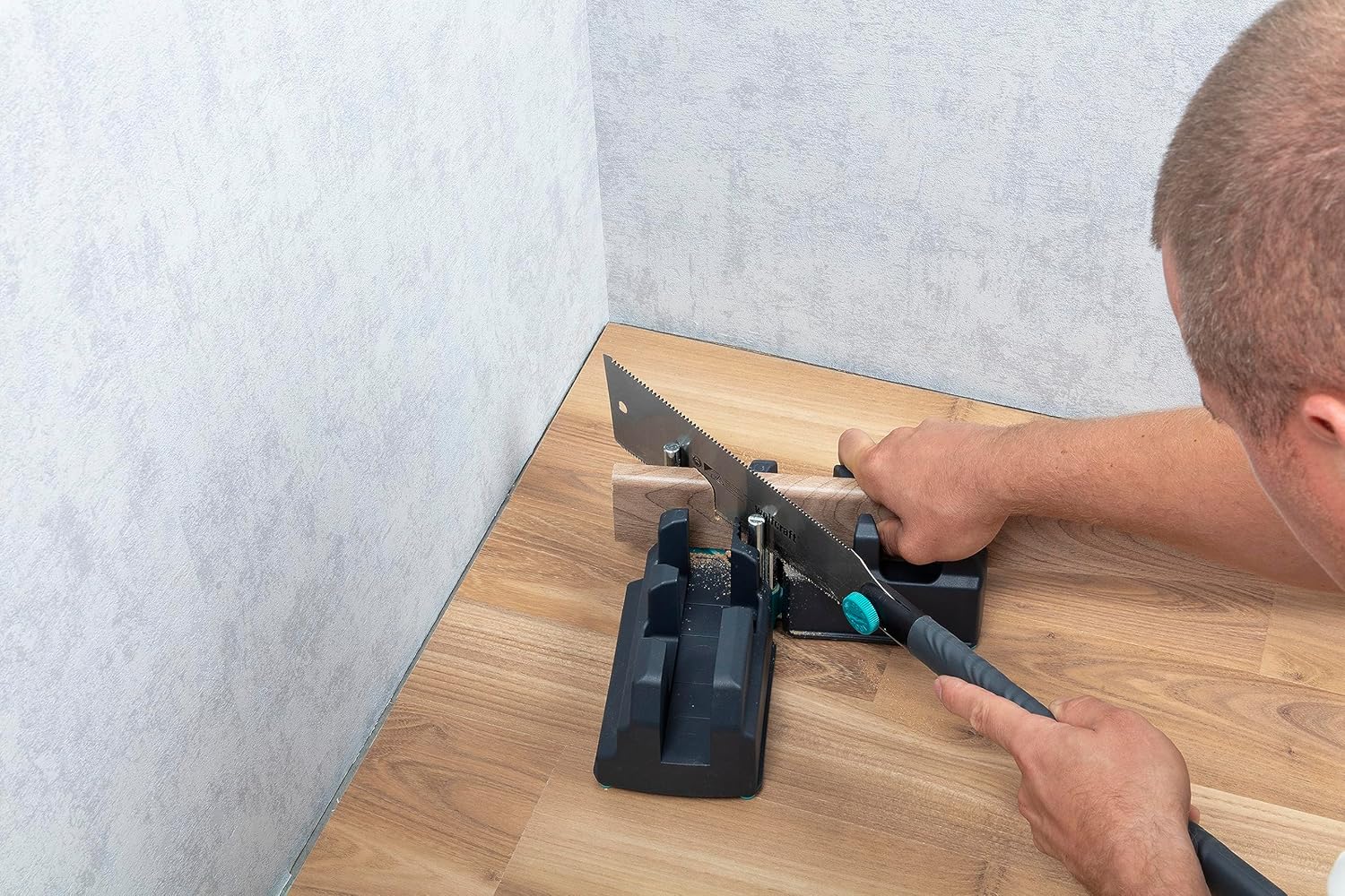 - Einfach Handhabung: Die Gehrungslade in der Ecke ansetzen und die Schenkel an die Wand anpassen, durch die Feststellschraube fixieren und die Fussleiste zum Sägen einsetzen - los geht's!