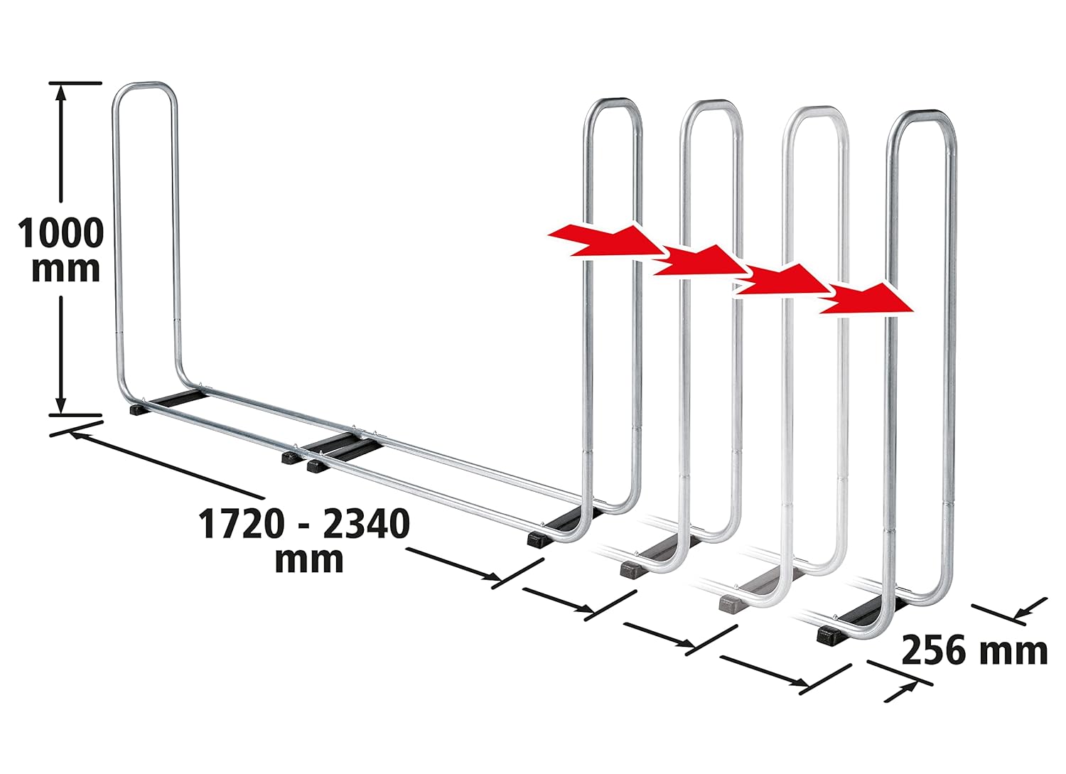 • Mit nur wenigen Handgriffen lässt sich das Kaminholzlager von 1,72 m auf 2,34 m Länge ausziehen und kann bis zu 1 m hoch mit Holz beladen werden