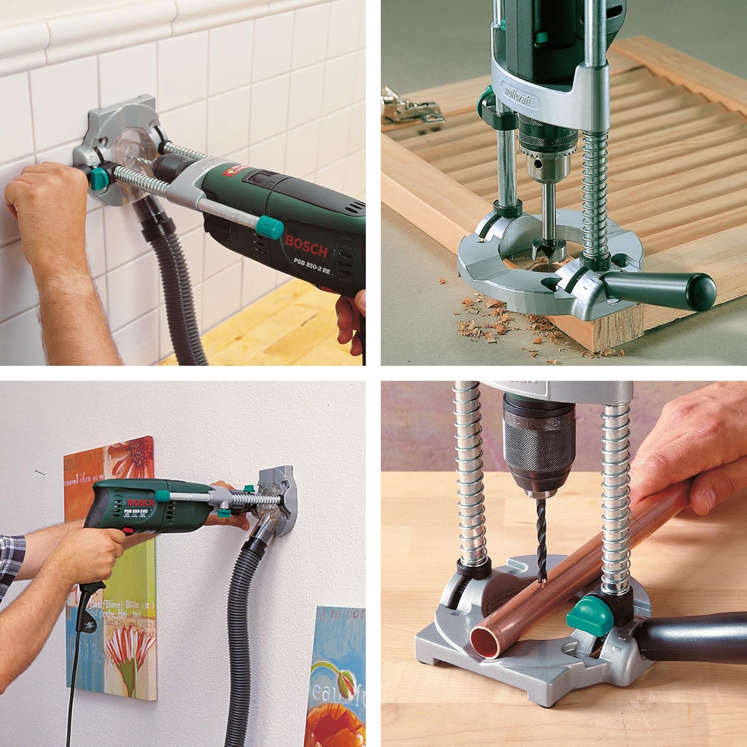 - Dank vier praktischen Schraublöchern kann der mobile Bohrhelfer in der Grundplatte auch stationär eingesetzt werden - mit einem Zusatzgriff für exaktes, sicheres Ansetzen und gegen Verrutschen
