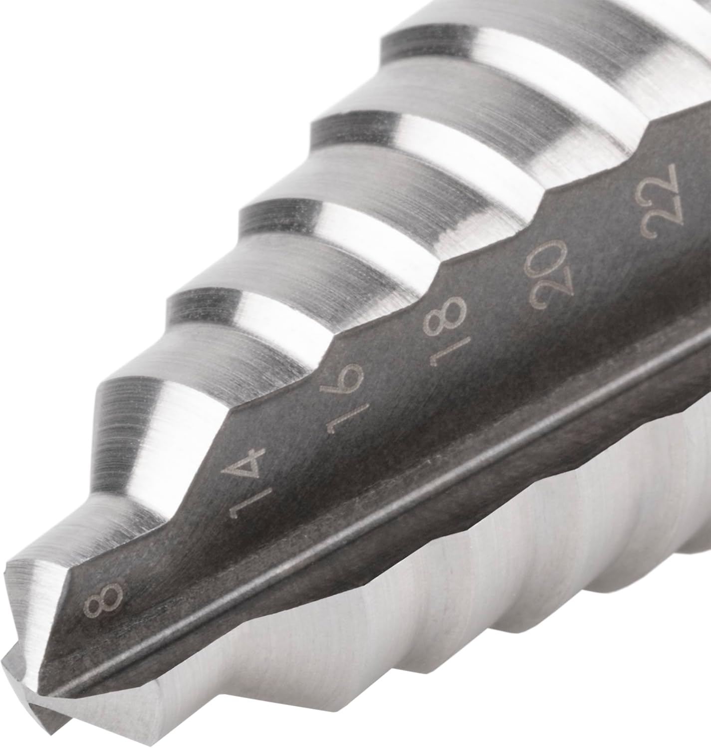 - Der Stufenbohrer wurde aus hochlegiertem Werkzeugstahl gefertigt (HSS)