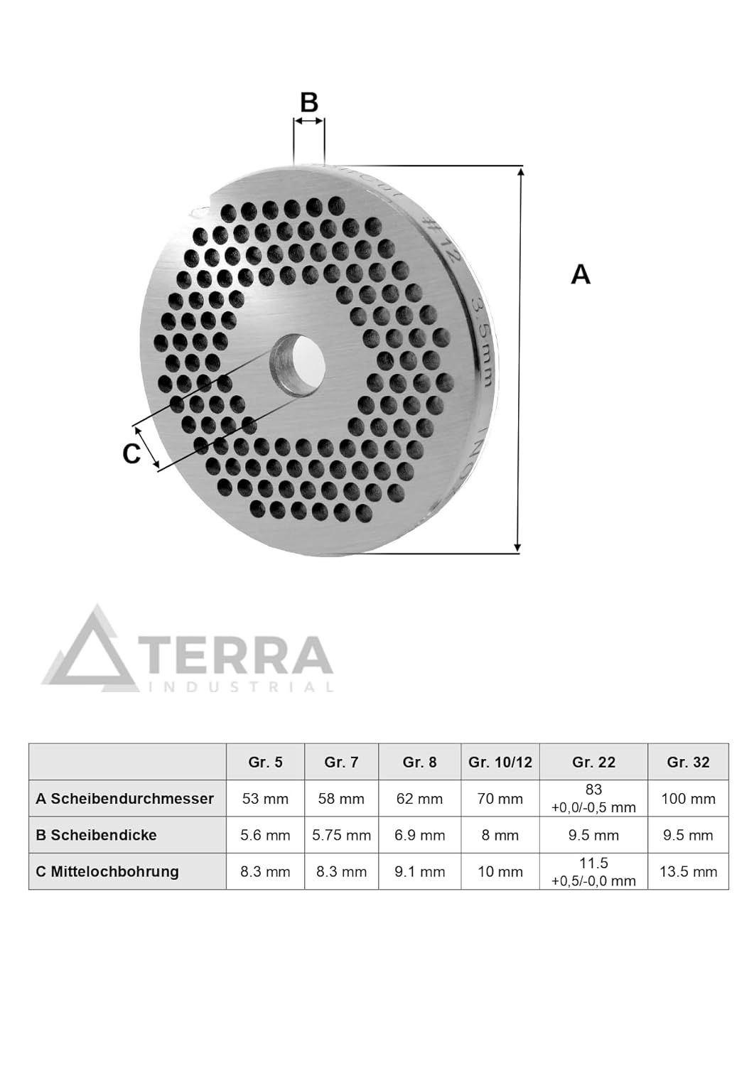 - INOX Lochscheibe in der Gr. 22 - 3,5 mm Bohrung +++ Geeignet u. a. für Fleischwolf Grösse 22. +++ Bohrungsdurchmesser: 3,5 mm +++ Scheibendurchmesser: 82 mm +++ Scheibendicke: 9,5 mm +++ Mittellochbohrung: ca. 11,5 mm +++