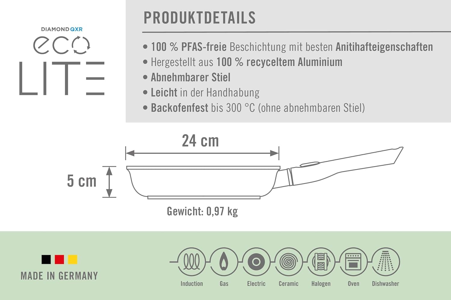 Woll Eco Lite QXR Flachpfanne - Induktiv - Ø 24 cm, 5 cm hoch, mit abnehmbarem Stiel - Geeignet für