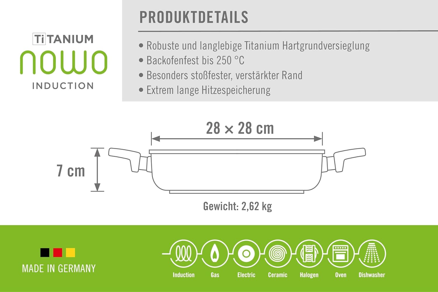 Woll Nowo Titanium Gusspfanne, viereckig, mit 2 Seitengriffen-Induktiv, 28 x 2 cm, 7 cm hoch-Geeigne