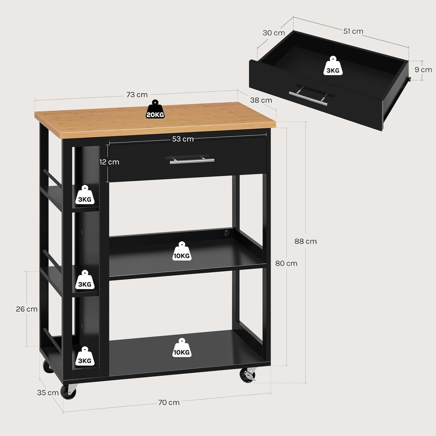 - STABIL & LANGLEBIG: Der Rollwagen ist aus exzellentem lackiertem MDF gefertigt und ist daher verschleissfest, korrosionsbeständig und langlebig. Die Arbeitsplatte ist 30 kg belastbar, kann einen Ofen tragen oder ermöglicht ein einfaches Kochen usw
