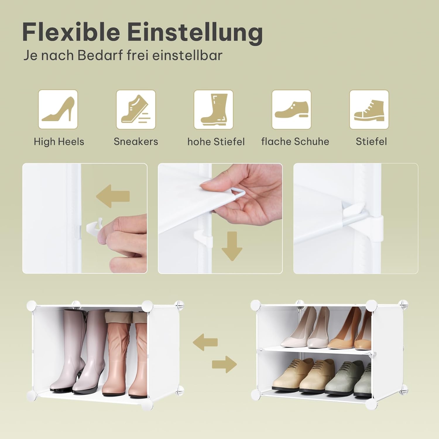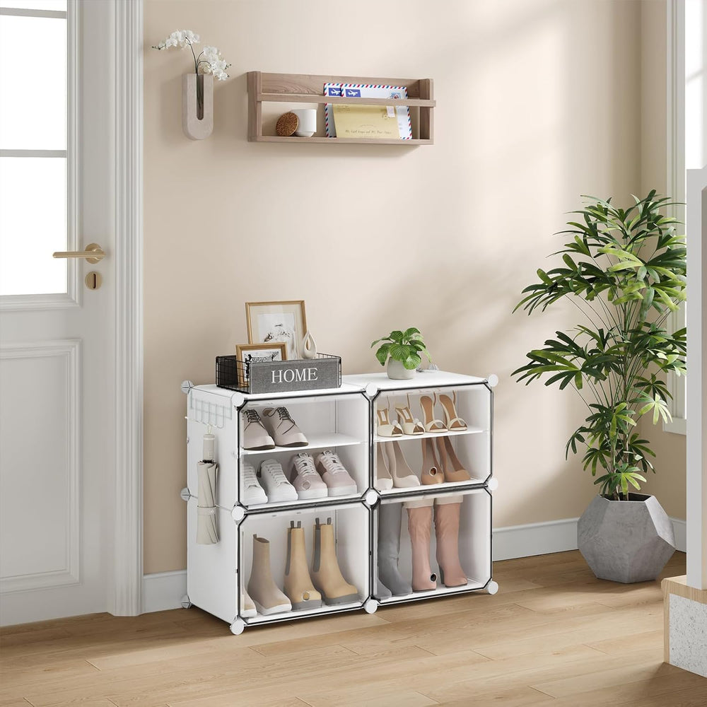 - 4 Ebenen Schuhregal: Der Schuhorganizer hat 2x4 Fächer für bis zu 16 Paar Schuhe. Sie können auch grössere Fächer schaffen, indem Sie einige der Trennwände für grössere Gegenstände wie Stiefel oder Plüschtiere entfernen. Die 5 seitlichen Haken