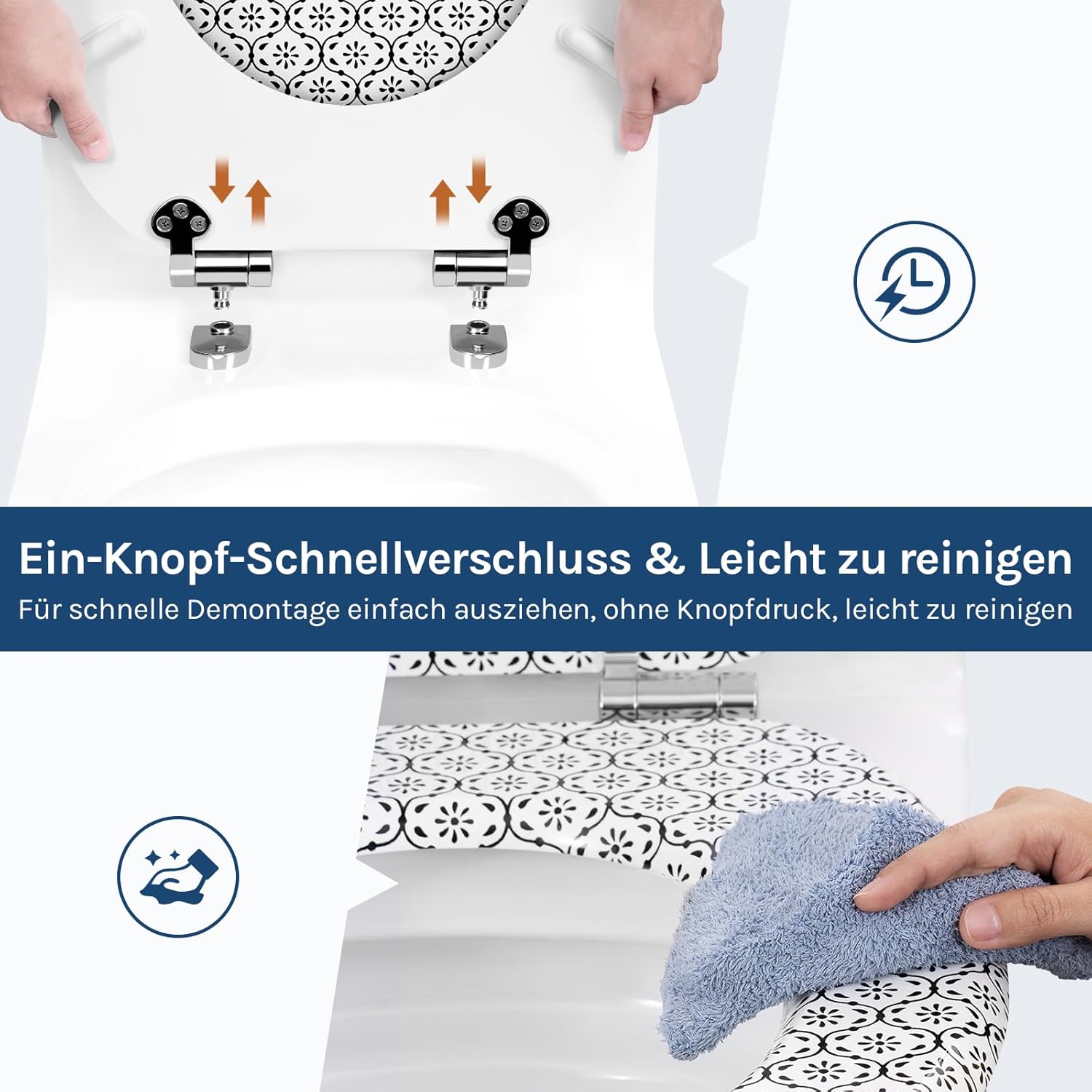 - QUICK-RELEASE FÜR EINFACHE REINIGUNG: Muss der MDF-Toilettensitz gründlich gereinigt werden? Heben Sie ihn einfach senkrecht an und schieben Sie ihn nach der Reinigung wieder in seine Position. Sie werden ein Klicken hören, wenn er eingerastet ist