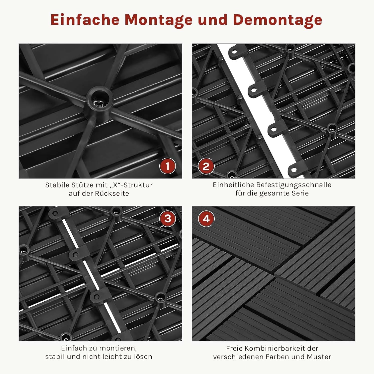 - Robustes, langlebiges Material: Terrassenfliesen besteht aus dem Verbundwerkstoff Wood Plastic Composite,60% Holzfaser und 30% Kunststoff, raue Oberfläche, Haltbar und Umweltfreundlich. Sie sind UV-beständiger als Holz, da sie Feuchtigkeit abstossen