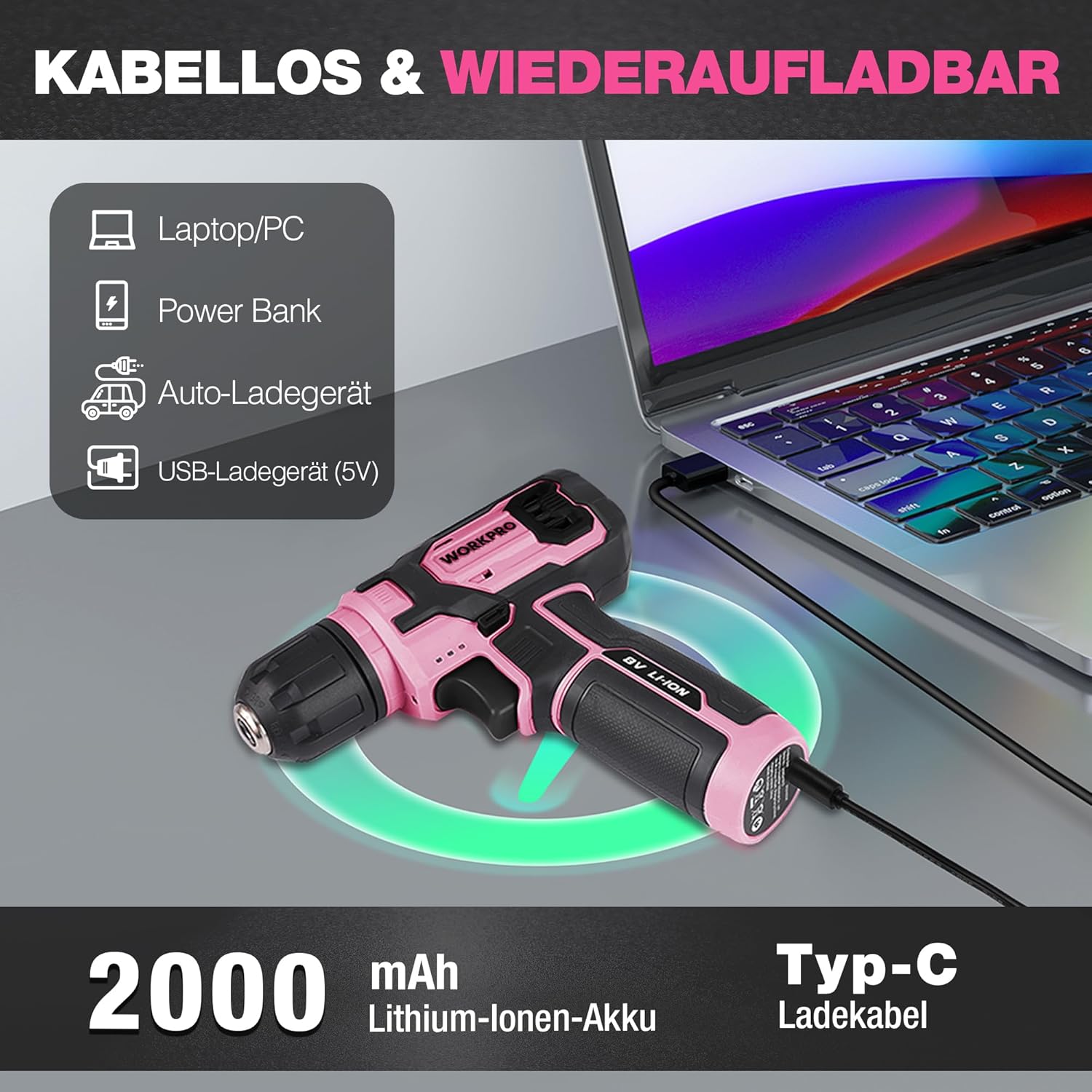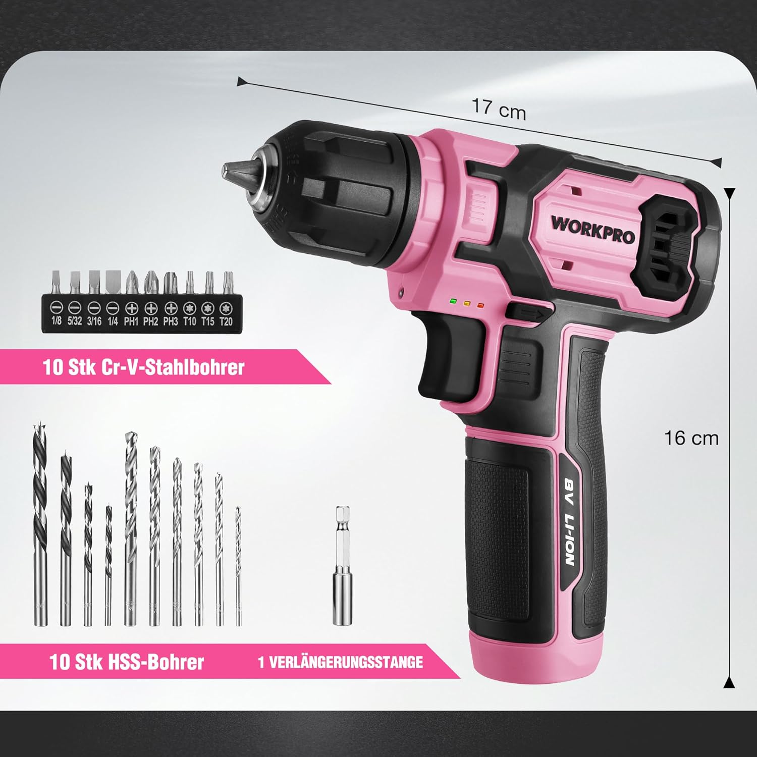 - Lieferumfang: 1 Lithium-Bohrschrauber, 1 USB-C-Ladekabel, 1 Schichtstapelbox, 10 Stk Cr-V-Stahlbohrer, 10 Stk HSS-Bohrer, 1 Verlängerungsstange