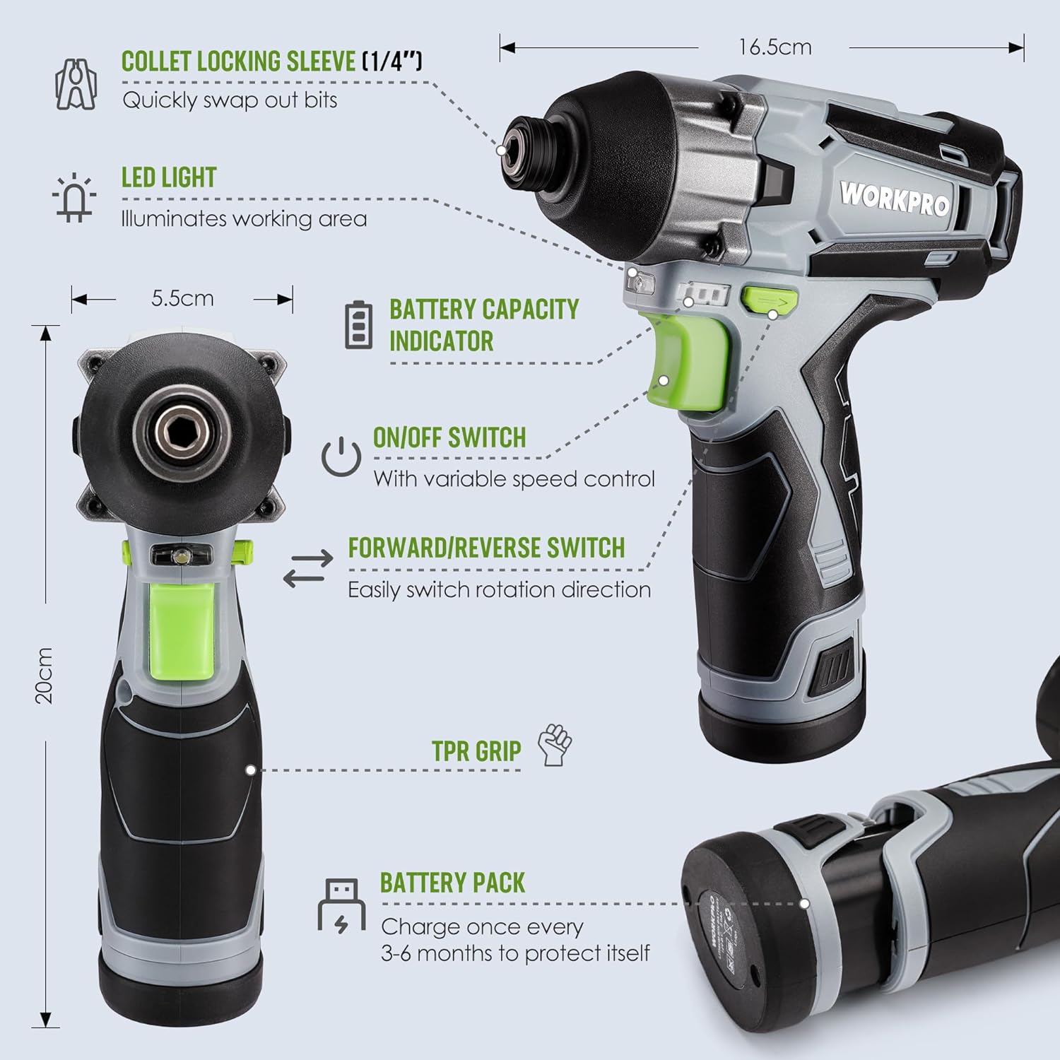 - 【Was Sie bekommen】 1 x 12V Akku-Schlagschrauber, 4 Steckschlüsseleinsätze (5, 6, 7, 8mm), 10 Bits (SL5, 6, PH1, PH2, PH3, H4, H5, H6, T15 , T25), Werkzeugtasche, 2-Ah-Li-Ion-Akku mit 1-Stunden-Schnellladegerät. Es ist perfekt für