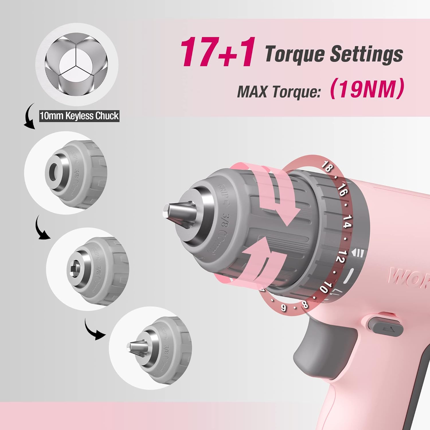 - đšăLeistungsstarkă 17+1 Drehmomenteinstellung bietet Geschwindigkeiten bis zu 750r/min und ein maximales Drehmoment von 19NM. Je nach Ihren unterschiedlichen Bohranforderungen können Sie das Drehmoment frei wĂ€hlen. 3/8ââ(10MM) schlĂŒsselloses