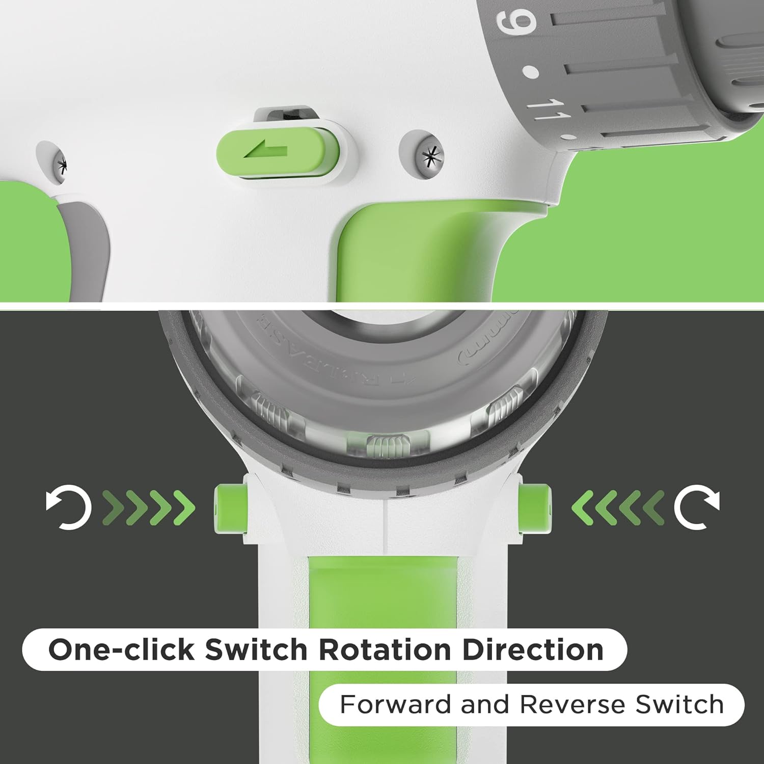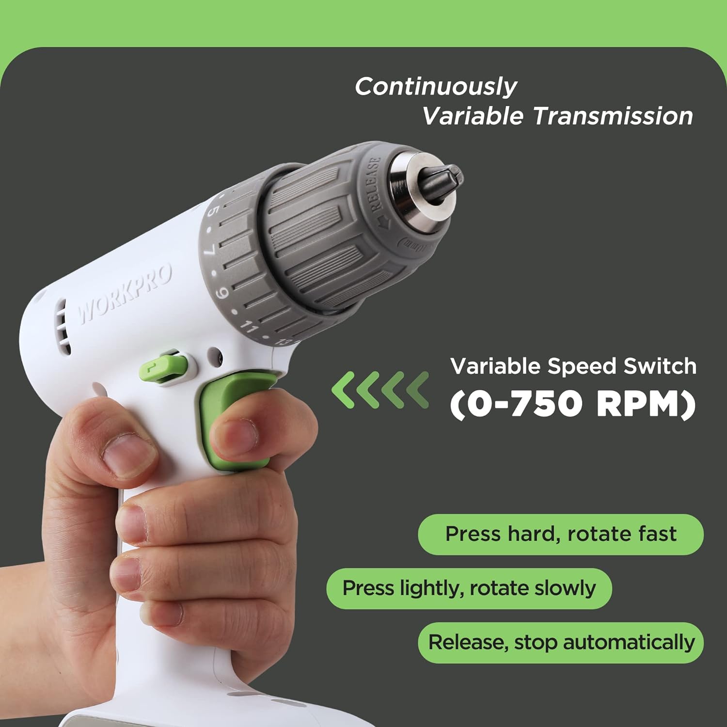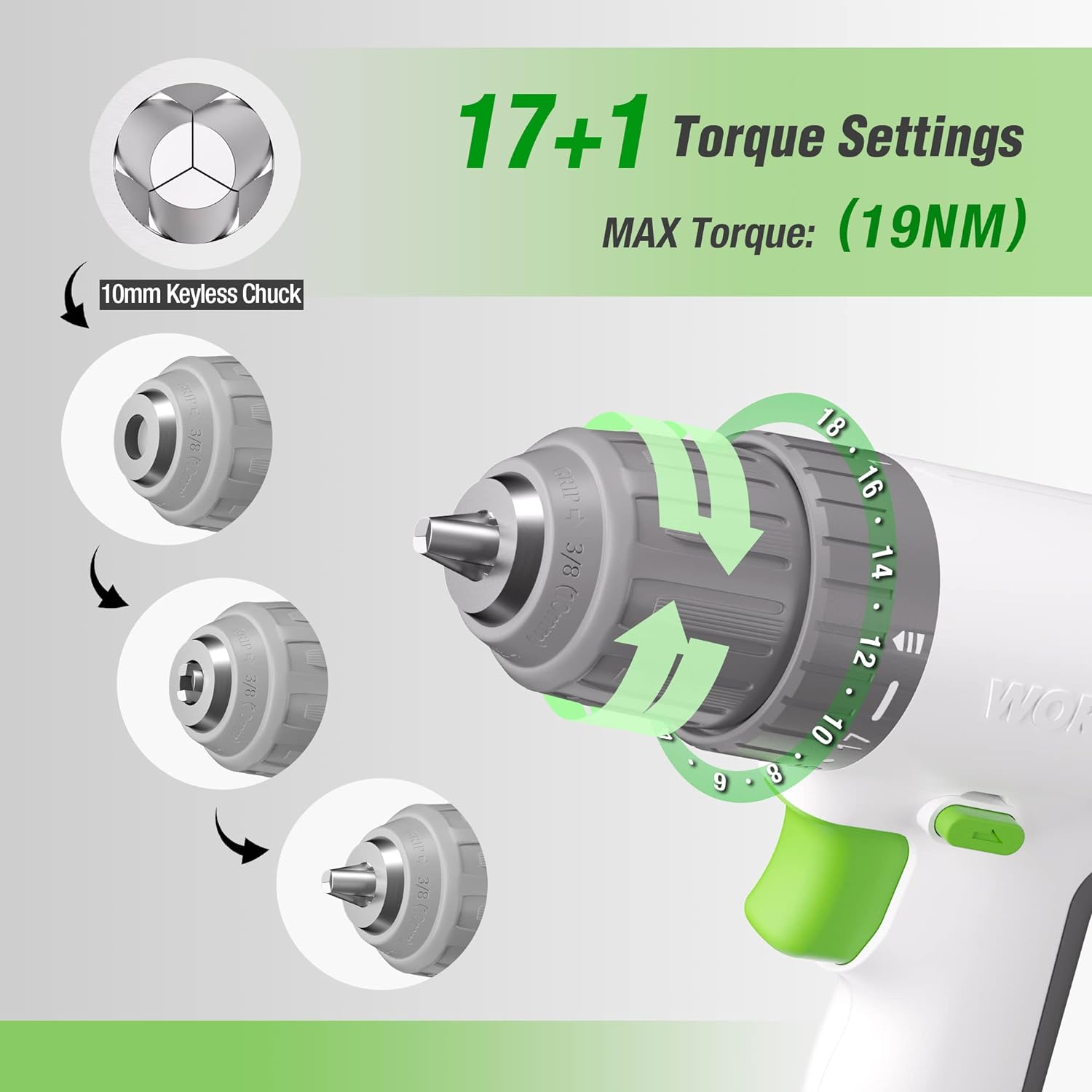 - đšăLeistungsstarkă 17+1 Drehmomenteinstellung bietet Geschwindigkeiten bis zu 750r/min und ein maximales Drehmoment von 19NM. Je nach Ihren unterschiedlichen Bohranforderungen können Sie das Drehmoment frei wĂ€hlen. 3/8ââ(10MM) schlĂŒsselloses