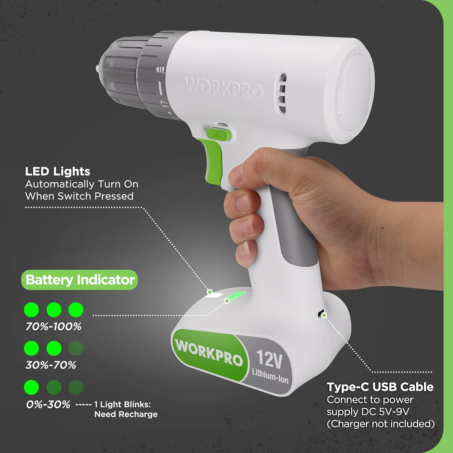 - đšăCleveres Designă Ausgestattet mit einer LED-Beleuchtung lĂ€sst es sich in dunklen Ecken gut arbeiten. Die Batterieanzeige zeigt deutlich den Batteriestand an. Mit dem Typ-C-USB-Kabel (1m) könnten Sie eine Verbindung zu einer Stromversorgung (DC