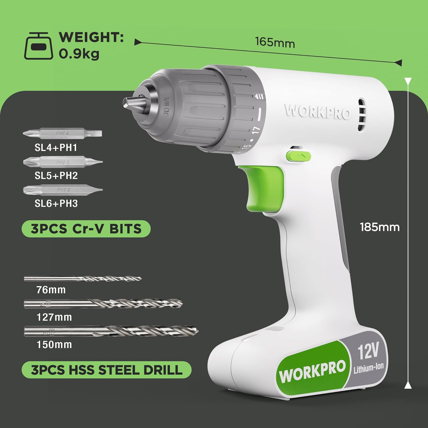 - đšăEinfach zu bedienenă Dieser 12V Akkuschrauber ist 165 mm breit, 185 mm hoch und wiegt 900g. Seine geringe Grösse und sein geringes Gewicht ermöglichen den Einsatz auf engstem Raum, und er lĂ€sst sich leicht mit einer Hand bedienen. Mit 3